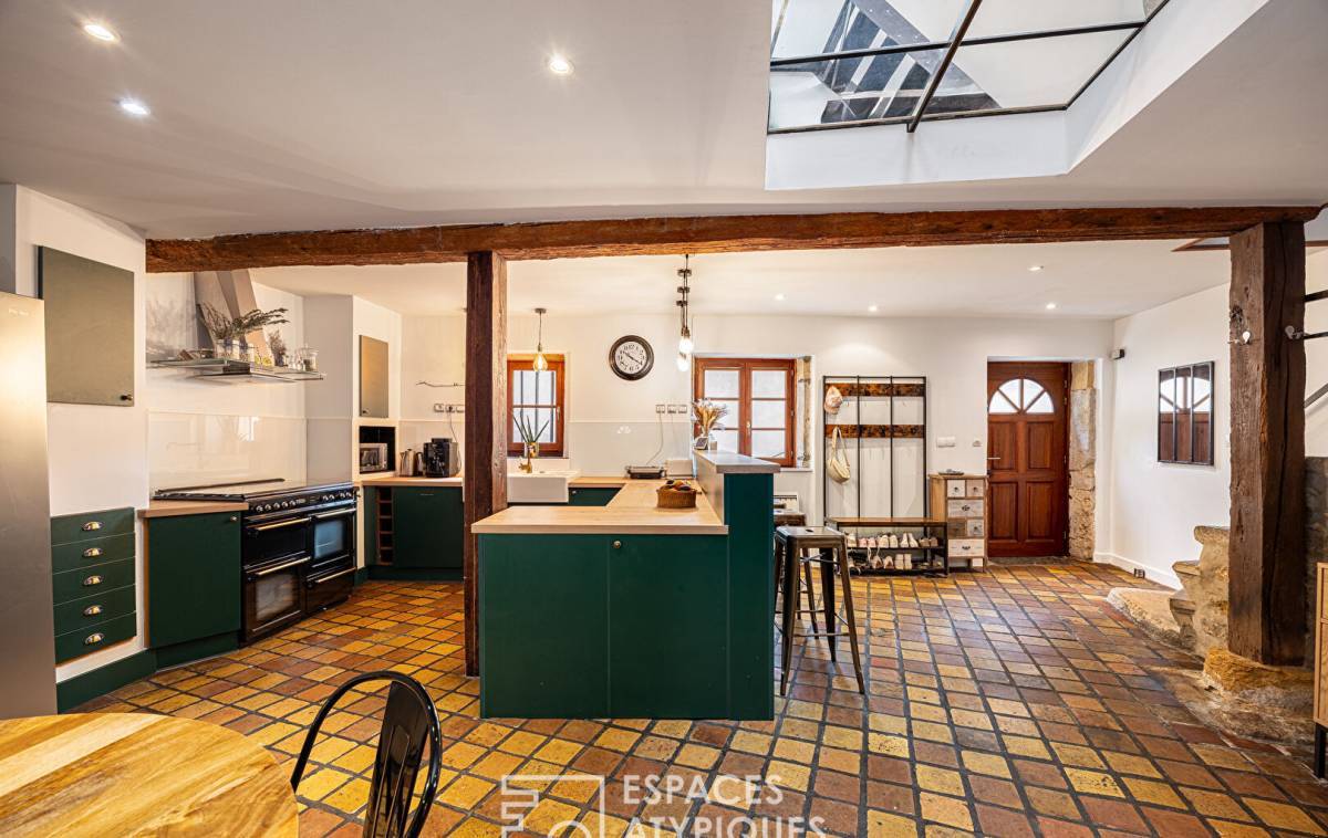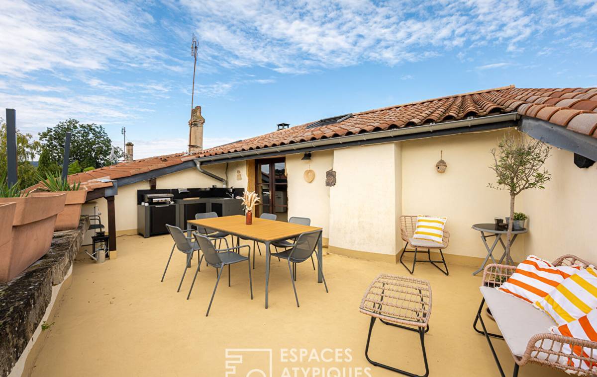 A second bedroom and a bathroom complete this level. A metal staircase leads to two additional bedrooms as well as an office and provides access to a 30 sqm rooftop terrace. The generous volumes, character, and character of this building make it a unique living space.
