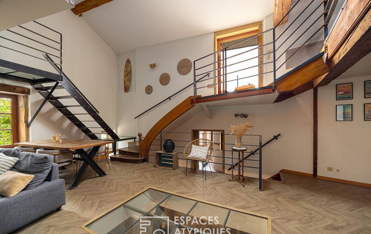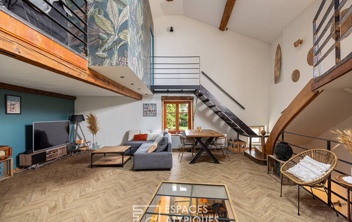 Located in the commune of Fontaines-Saint-Martin, just 15 minutes from Lyon, this former 1850 farmhouse has been completely renovated to become a 220 sqm triplex loft house.