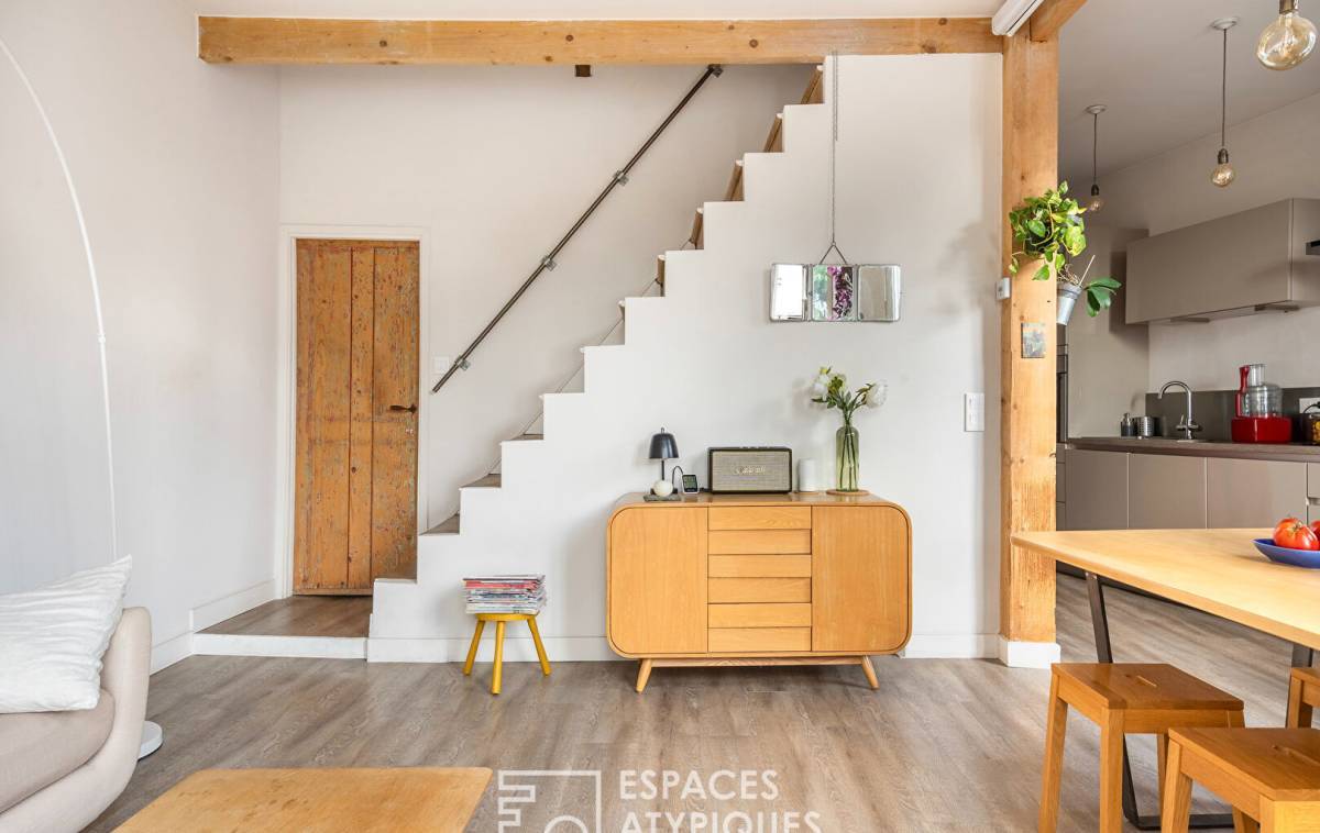 A staircase with clean and elegant lines leads to the first floor, where a vast living space bathed in light opens up. The discreet and functional fitted kitchen blends naturally into the hallway and extends towards the dining room and living room. At the center of this space, a custom-made table embraces a wooden beam, a unique architectural detail that reinforces the warm and friendly atmosphere. Facing the large half-moon window, the living room transforms into a cocoon, a soothing place that invites relaxation. An elegant bathroom with a toilet completes this level, which also houses a spacious office/library. The latter offers great flexibility in terms of layout and can easily be redesigned as a bedroom.