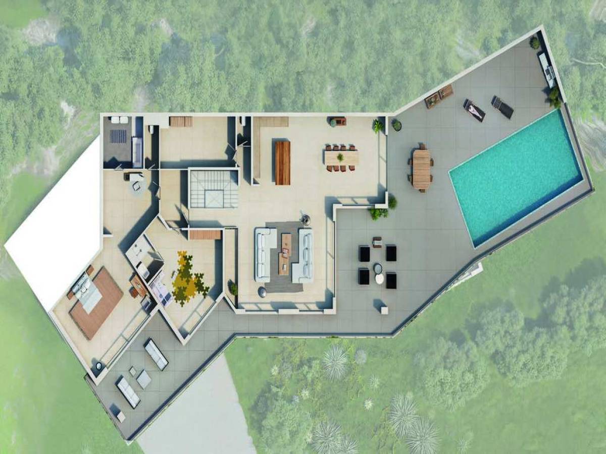 Layout: Six principal rooms organized around generous volumes and seamless indoor-outdoor flow.