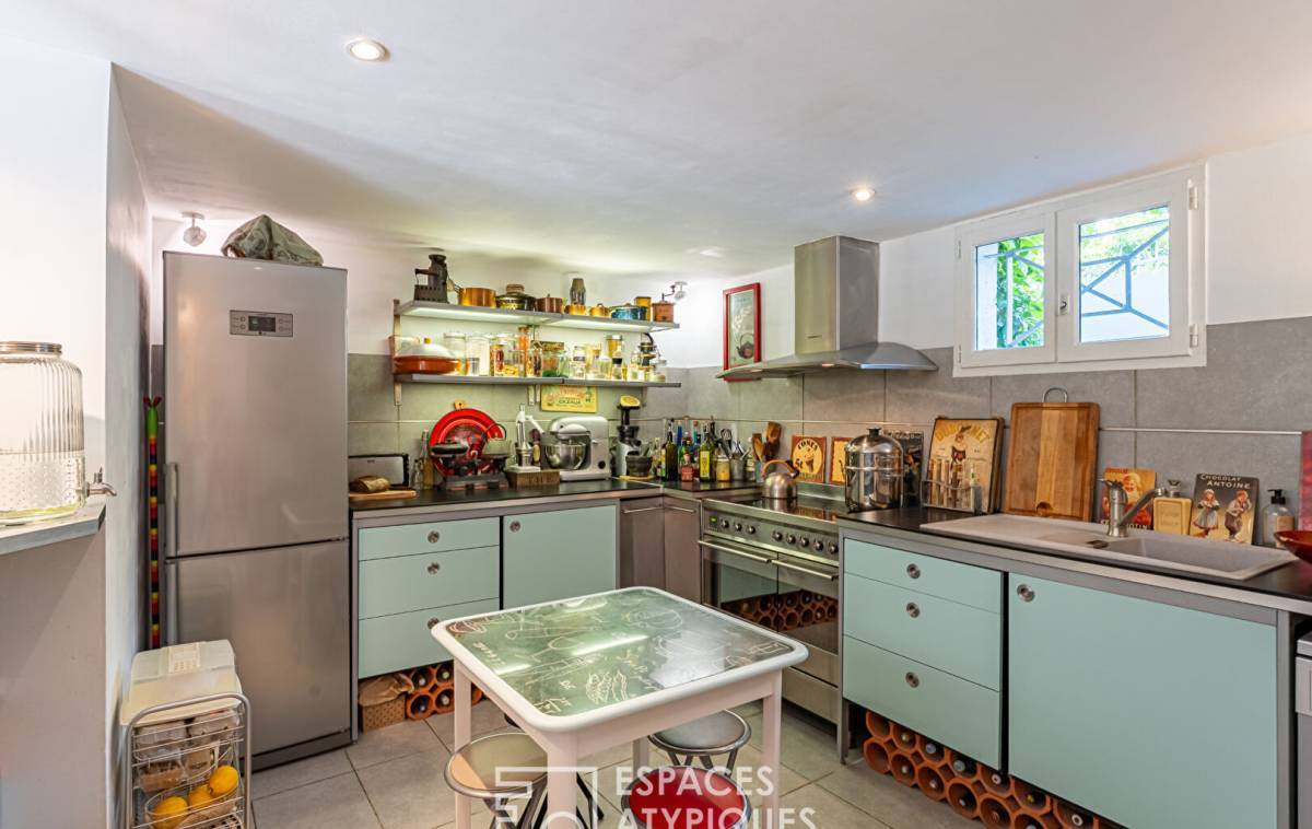 On the garden level, the kitchen opens onto a living room with direct access to the garden, creating a beautiful continuity between the interior and exterior.