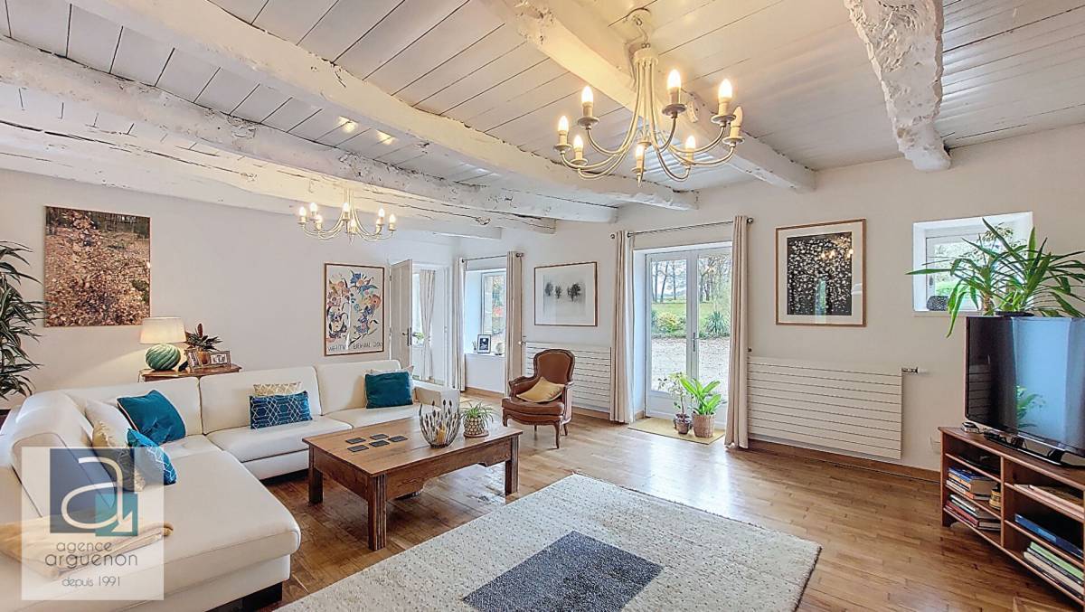 SOLE AGENCY: Located in a quiet countryside location just minutes from the vibrant and popular village of Jugon-les-Lacs with its market square of restaurants, shops and bars and leisure lake and with easy access to the major road networks taking you to Lamballe, Saint Brieuc, Rennes, Dinan, Saint Malo and beyond this magnificent 'longère' would make the ideal family home. Refurbished throughout by the current owners using premium quality materials and decorated with great taste the property is absolutely in 'ready to move into' condition and benefits from all of the comforts for modern living and is flooded with natural light. The spacious and flexible accommodation all of which enjoys a dual aspect comprises on the ground floor; living room with feature fireplace and wood burner, utility room with WC, formal dining room, fitted and equipped kitchen / family room and an office with large storage room off. Two separate staircases lead to the first floor, the first from the office provides access to a stunning guest suite of 45m2 habitable space with sitting area and private shower room with WC and the second from the dining room to a spacious landing leading to the master bedroom suite with walk in wardrobes and a private bathroom with bath and separate shower and WC, two further bedrooms and a family shower room with WC. The property also benefits from a garage / workshop and two smaller outbuildings perfect for garden storage . The grounds are beautifully maintained with a sweeping driveway and gravel parking for several cars and feature landscaped gardens to the front and back and two wooded copses as a haven for wildlife. All in all a stunning property - one of our best. (4.00 % fees incl. VAT at the buyer's expense.)