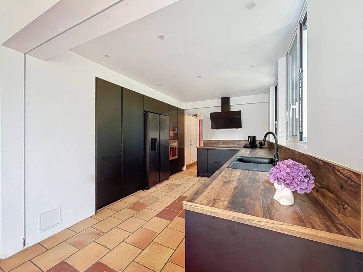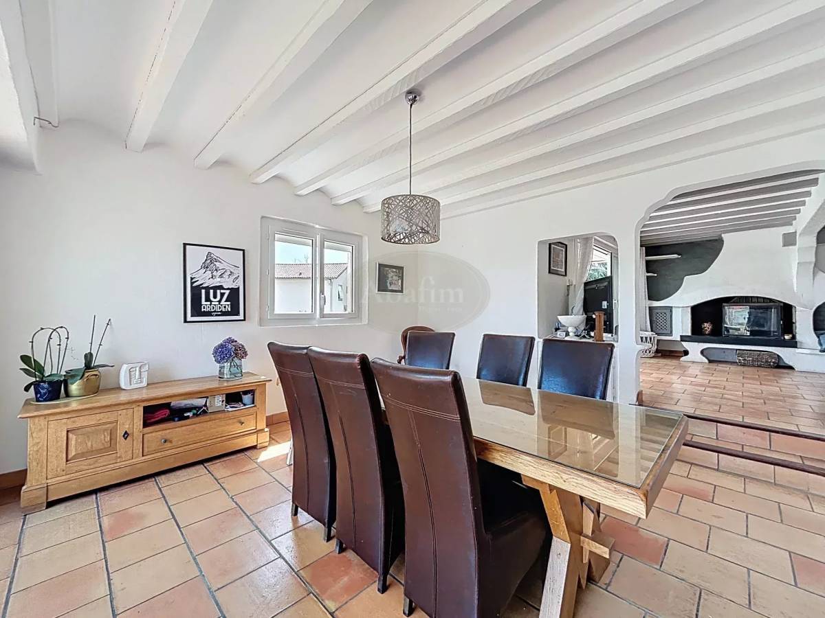 The central hallway serves harmoniously the various rooms. To the left, after the toilet, is the spacious kitchen, renovated in a contemporary style. Fully equipped, it opens to the dining room and its terrace. This convivial space is ideal for entertaining. Continuing on, the 37m² sitting room has a fireplace and vaulted ceiling and benefits from the wide openings to the exterior, reinforcing the sensation of space and liberty. Two terraces invite you to relax: one is east facing and covered, ideal for cool mornings. The other is south facing with a nice view of the pool with the Pyrenees as backdrop. To the right is a cinema room, or study space, as you wish.
