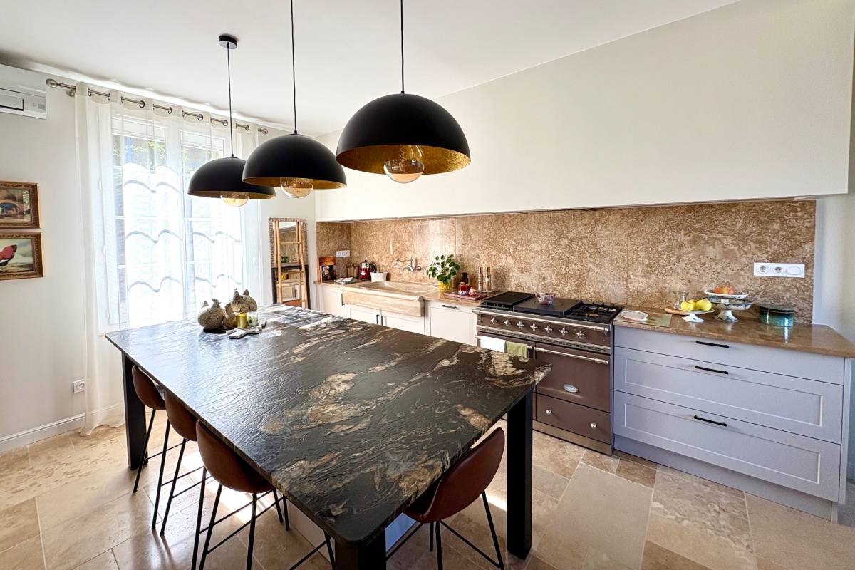The home features reversible air conditioning and electric radiators for comfort year-round. New double-glazed windows, large tiles, and travertine and wood floors enhance its classic appeal. Outside, the enclosed garden, with its potential for a pool, summer kitchen, and barbecue area, promises many relaxing moments. Additional amenities include two workshops, a steel garden shed, a large garage, and private parking in front. A gated entrance provides direct access to the garden, emphasising its secluded yet accessible nature.