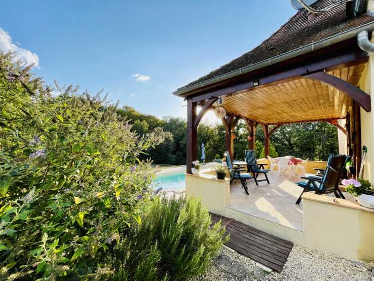 This house was designed exceptionally well by an architect(2010), it comprises 4 large bedrooms, one on the ground floor with its own shower room and a mezzanine leading to the bedroom upstairs. Another shower room, 1 bathroom, 4 toilets. This bright, spacious family home breathes harmony. Made with high quality materials, with stunning exposed oak beams and solid wood parquet flooring, underfloor heating with heat pump. South facing view from the terrace onto the swimming pool with its lovely spring rockery and large garden. Calm, serene location, 8 minutes from Le Buisson de Cadouin with all amenities schools and also a train station. A large beautiful kitchen/dining room leads to a living room with a wood burner. Downstairs there is a "granny flat" (bedroom, bathroom, kitchen/diner leading out onto the terrace) further more, a laundry room, wine cellar, garage and workshop. A well thought out house that would make a great year-round house or a large holiday home !