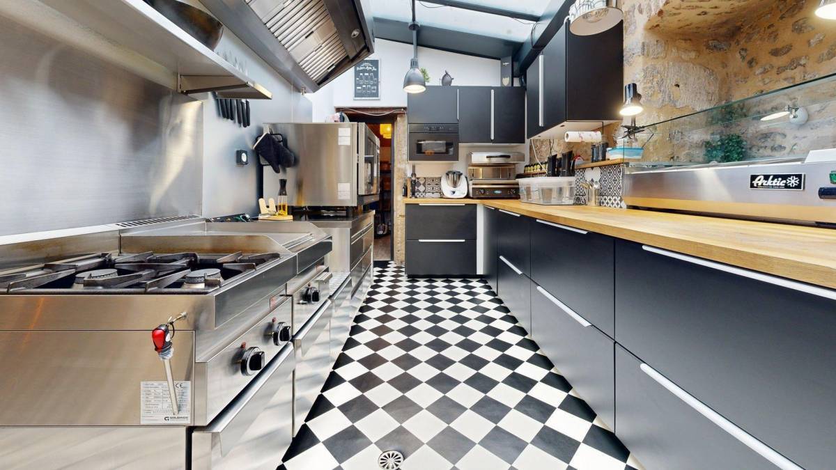 A large living room and dining room, each warmed by a Godin wood stove in an original fireplace, open onto a semi-professional equipped kitchen, ideal for enthusiasts or a catering business.