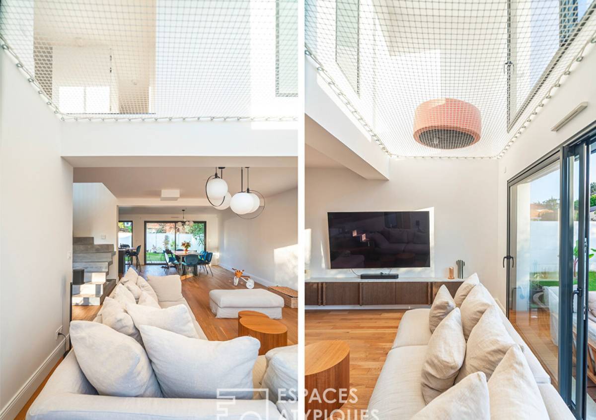 Fully open to the gardens, the 69m² living room becomes an observatory of omnipresent nature.