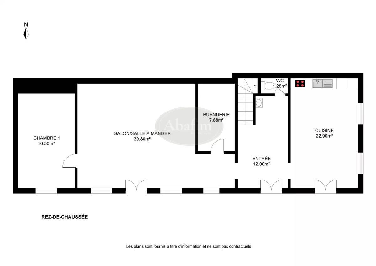 The 12m² entrance hall serves, from right to left, the 22m² fitted kitchen, a toilet, 7.60m² laundry, 39m² living/dining room and a passageway serving a 16.50m² space for use as a bedroom or office.