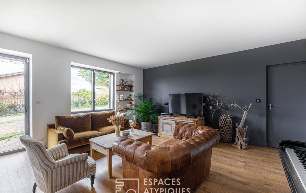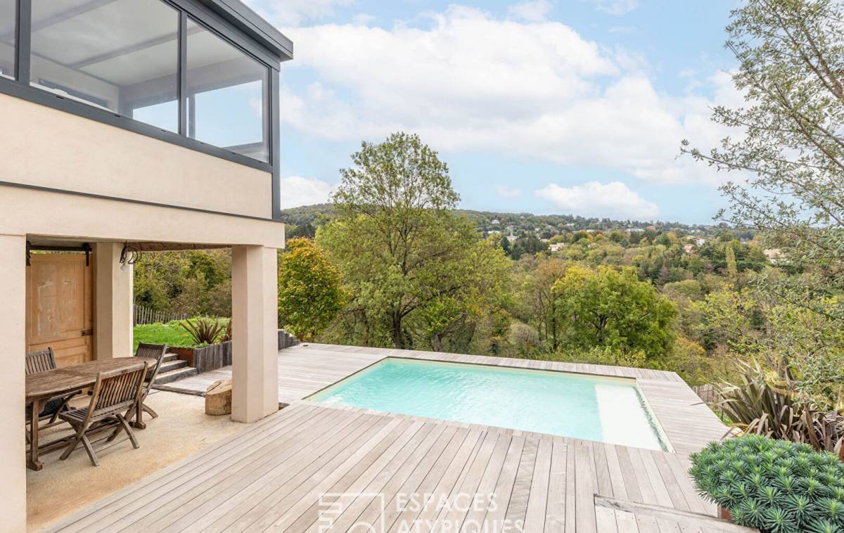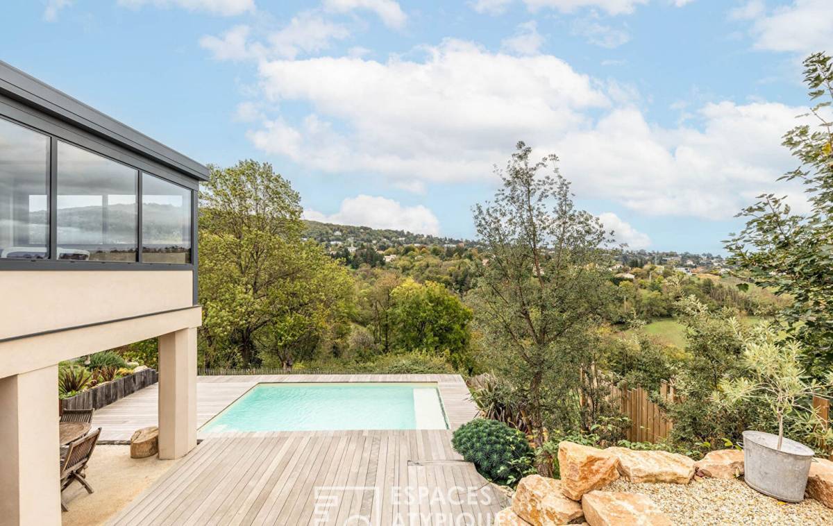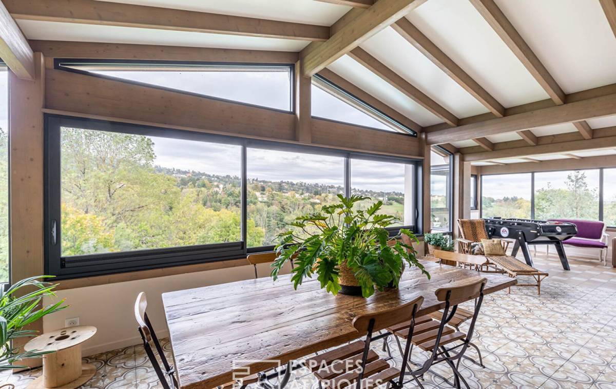 Located in the highly sought-after town of Limonest, in the Monts d'Or, this former farmhouse has been completely renovated and represents the perfect union of beautiful materials, developing an area of 250sqm on a plot of 812sqm. The entrance opens onto a vast living room which combines a dining area with an open kitchen and a living area set in a contemporary extension with views of the valley of Saint Didier au Mont d'Or and Fourvière. This level is completed by a lounge area / TV corner. A staircase will take its guests to the first level which consists of two large bedrooms sharing a bathroom. The top level consists of a bedroom, a bathroom and a master bedroom with a private shower room. A studio with independent access from the outside or via the house completes this old building. Outside, a beautiful garden with trees has been designed to enjoy sunny days by the pool. 10 minutes walk / 2 minutes drive from the center of Limonest and amenities. Buses nearby. The renovation, the quality of the materials and the view are undeniable assets of this renovated farmhouse. DPE C/D
