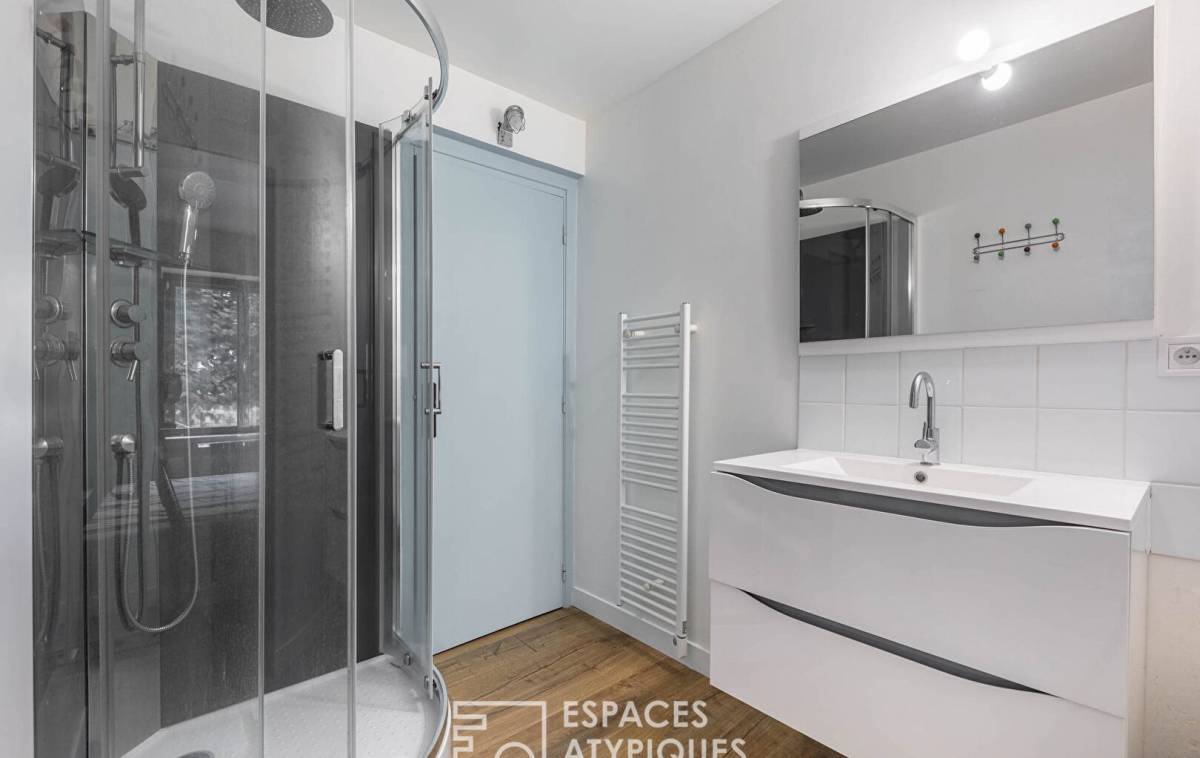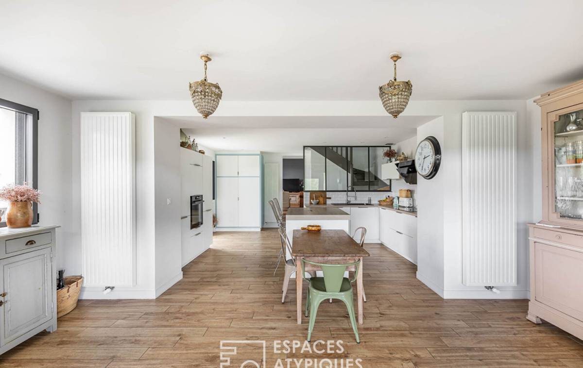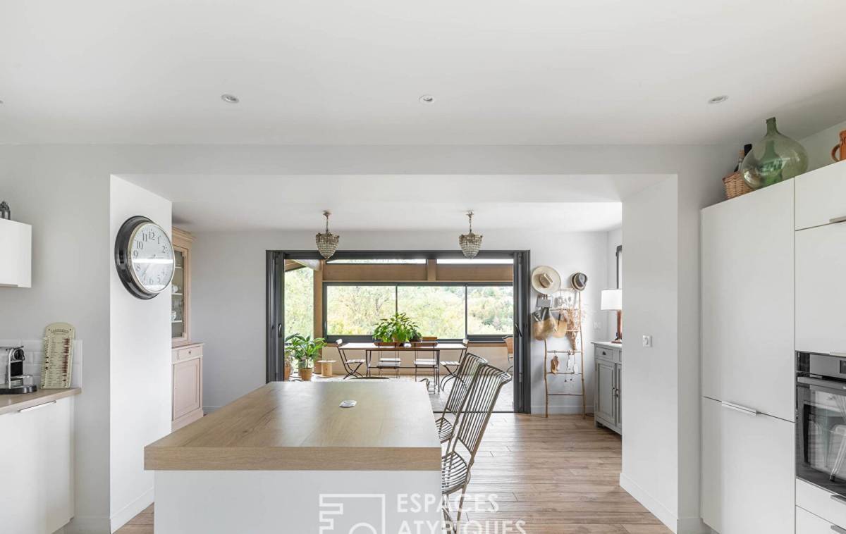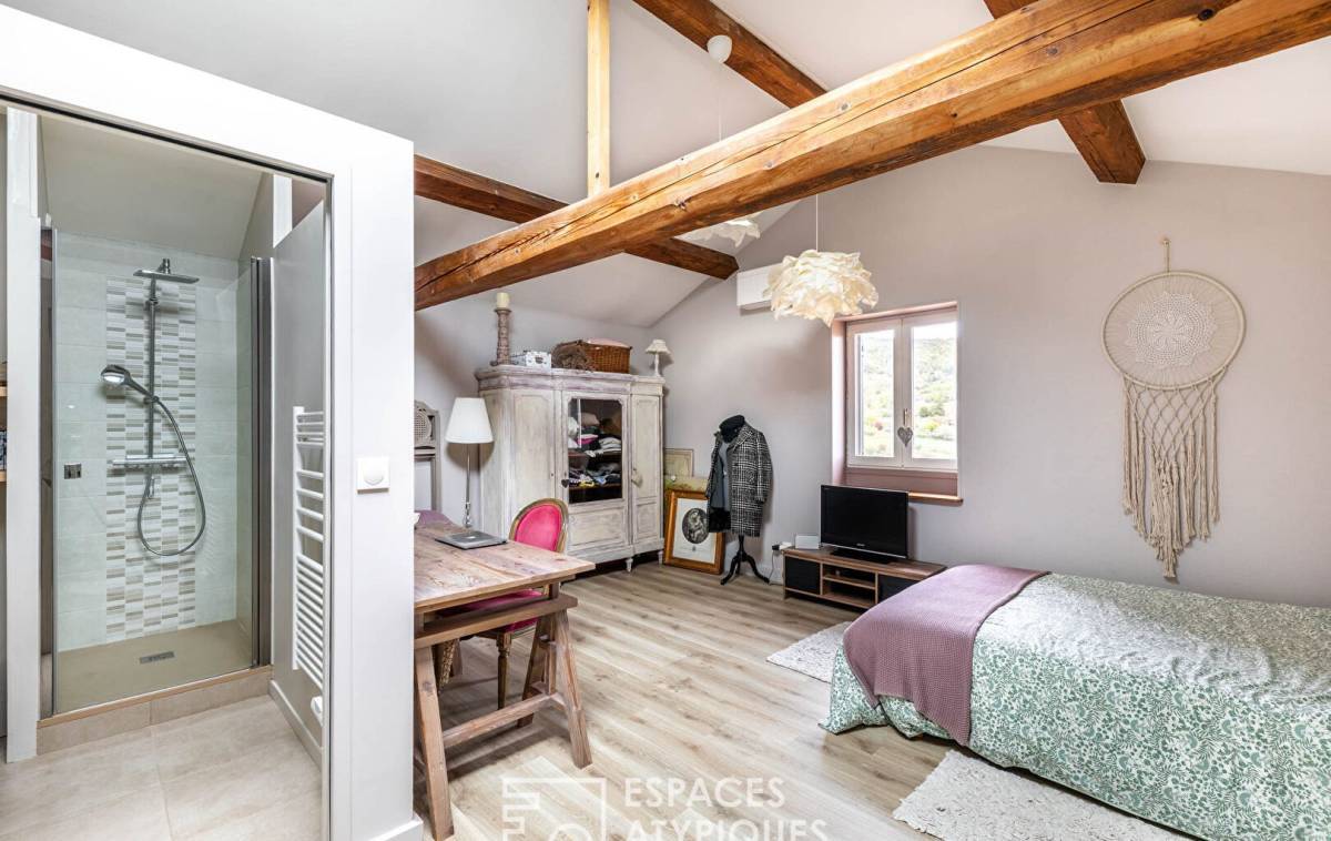 Located in the highly sought-after town of Limonest, in the Monts d'Or, this former farmhouse has been completely renovated and represents the perfect union of beautiful materials, developing an area of 250sqm on a plot of 812sqm. The entrance opens onto a vast living room which combines a dining area with an open kitchen and a living area set in a contemporary extension with views of the valley of Saint Didier au Mont d'Or and Fourvière. This level is completed by a lounge area / TV corner. A staircase will take its guests to the first level which consists of two large bedrooms sharing a bathroom. The top level consists of a bedroom, a bathroom and a master bedroom with a private shower room. A studio with independent access from the outside or via the house completes this old building. Outside, a beautiful garden with trees has been designed to enjoy sunny days by the pool. 10 minutes walk / 2 minutes drive from the center of Limonest and amenities. Buses nearby. The renovation, the quality of the materials and the view are undeniable assets of this renovated farmhouse. DPE C/D
