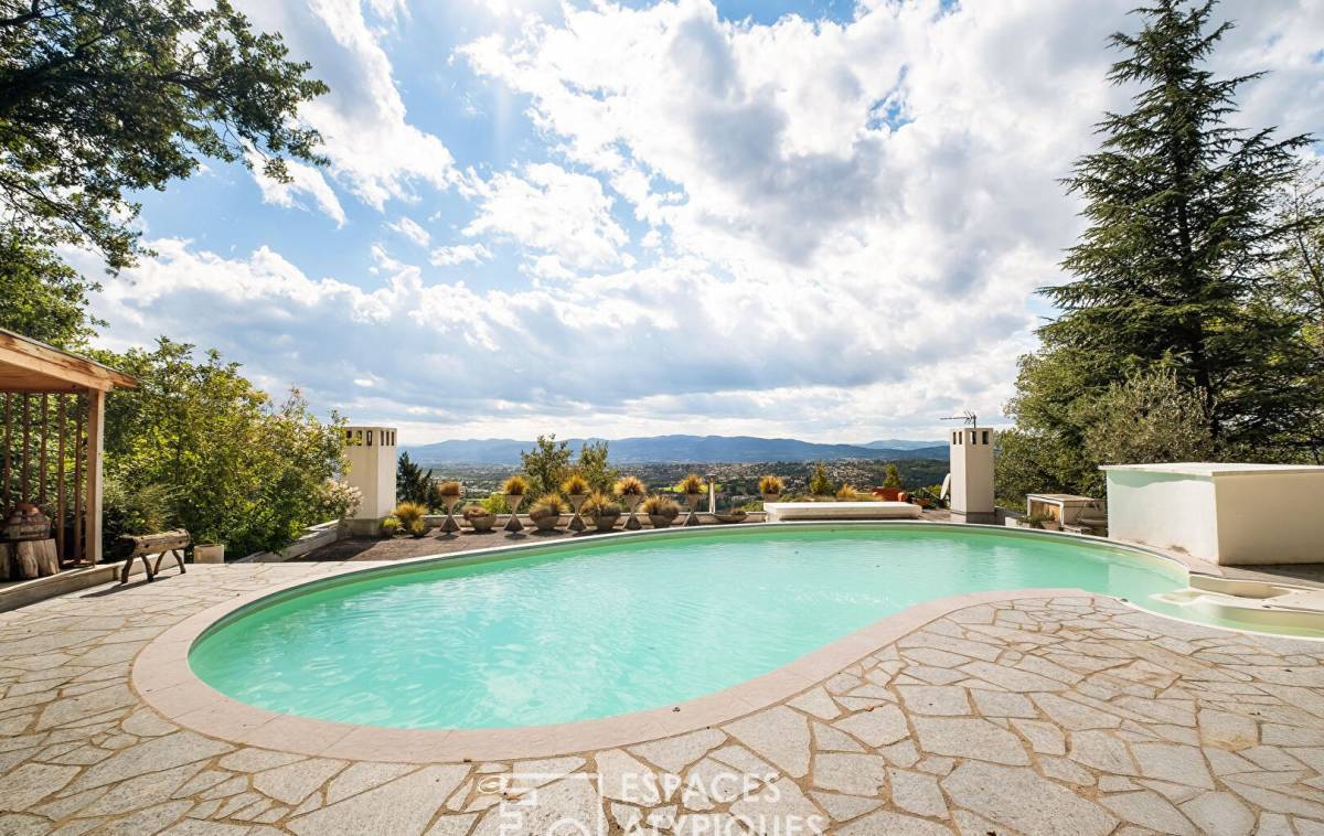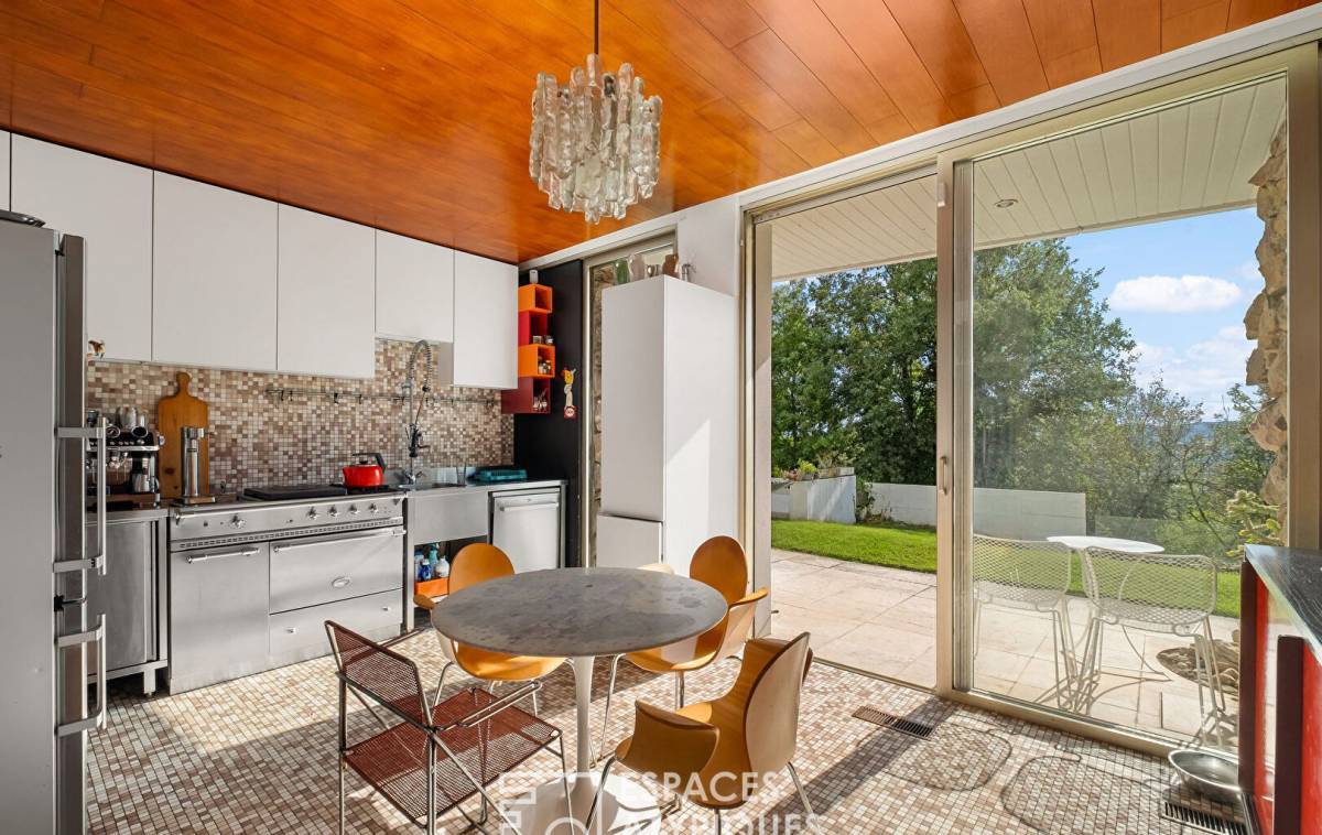 Nestled in the heights of Limonest, in the heart of a wooded setting of 4172 sqm, this project by Georges Guillemont, a figure of the brutalist movement, unfolds its 242 sqm in a sculptural and timeless setting.