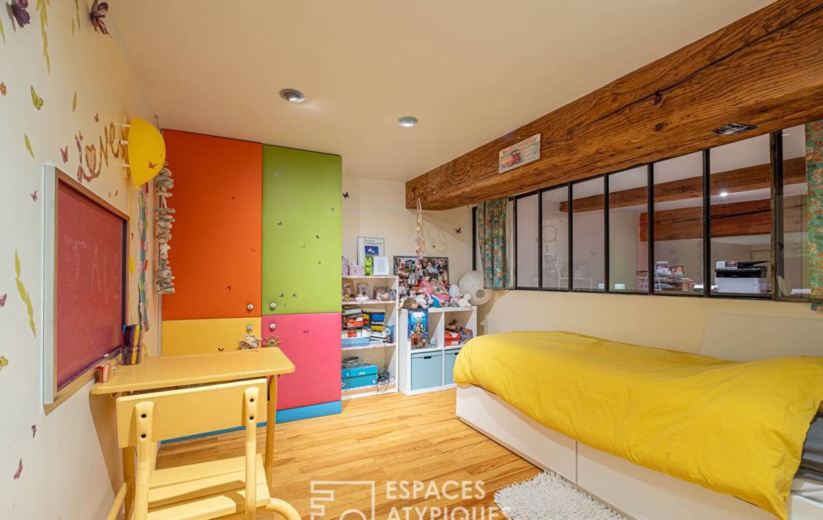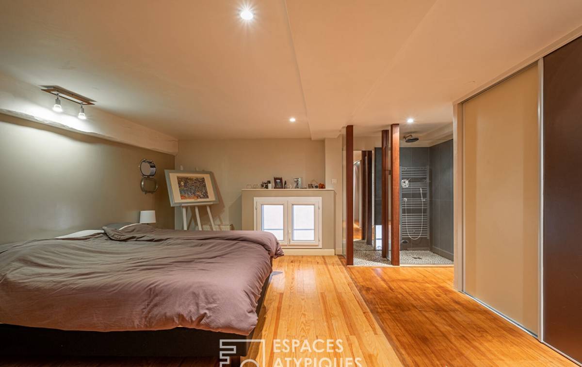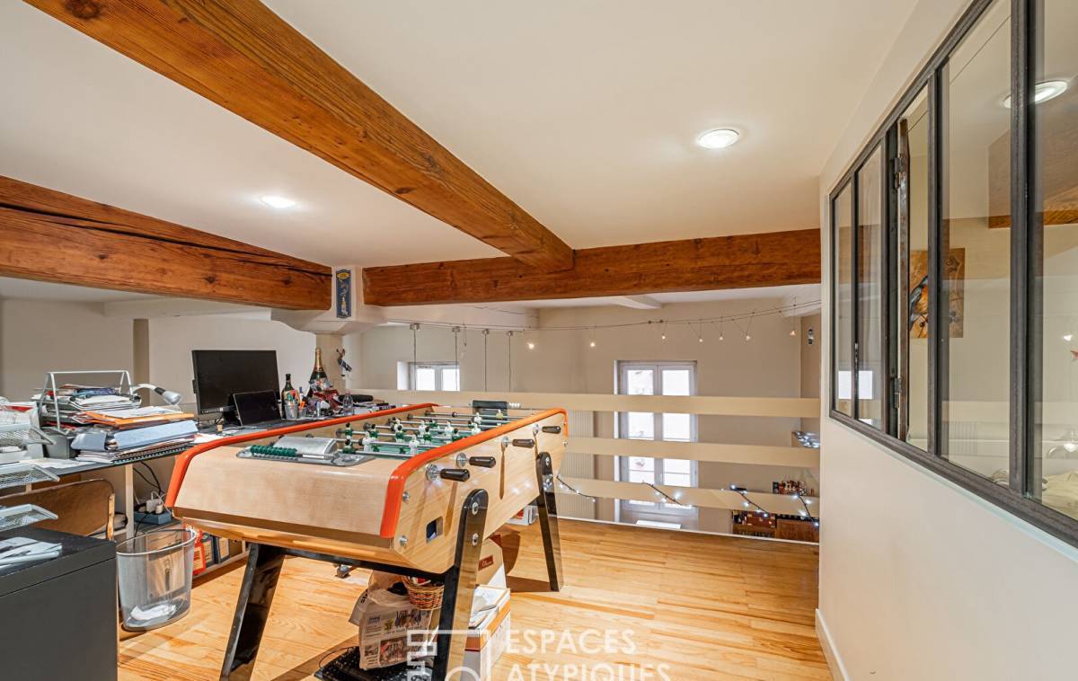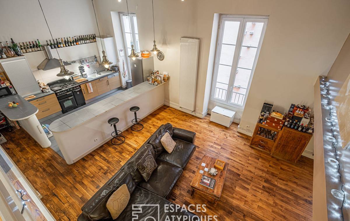 The entrance provides access to the large living room where lounge, living room and open kitchen come together. The volumes and ceiling height recall the loft spirit.