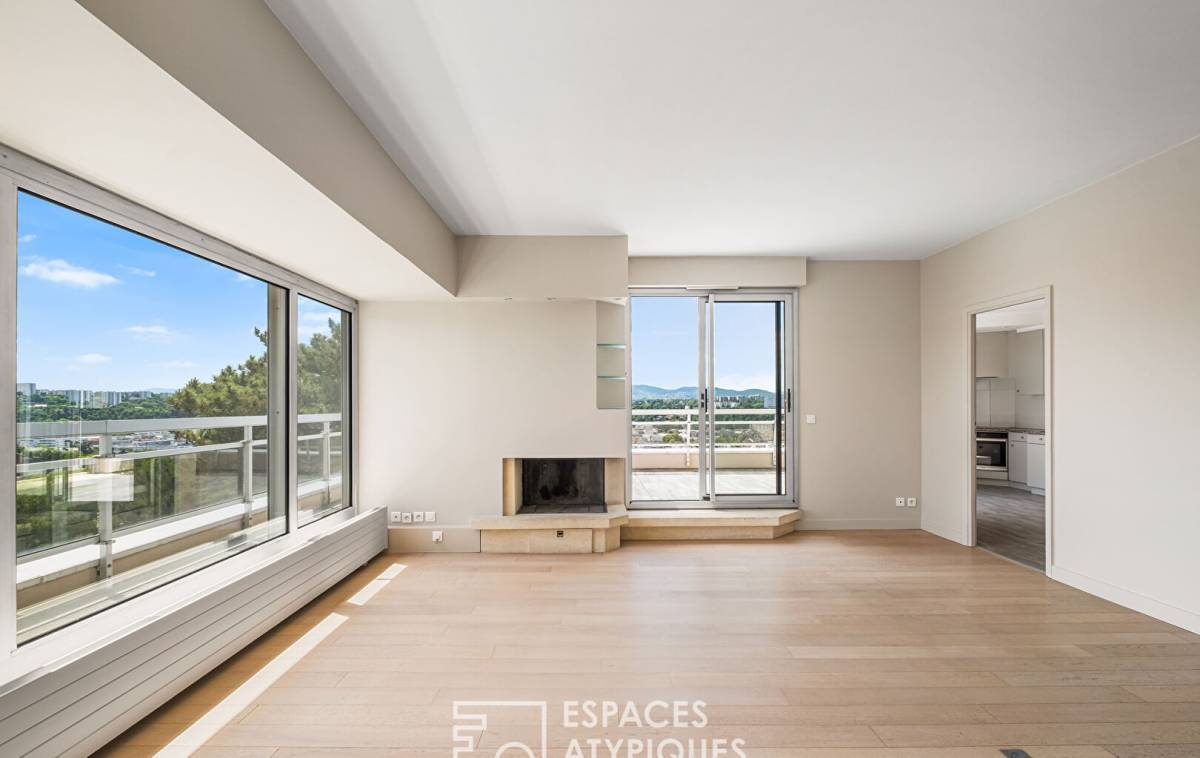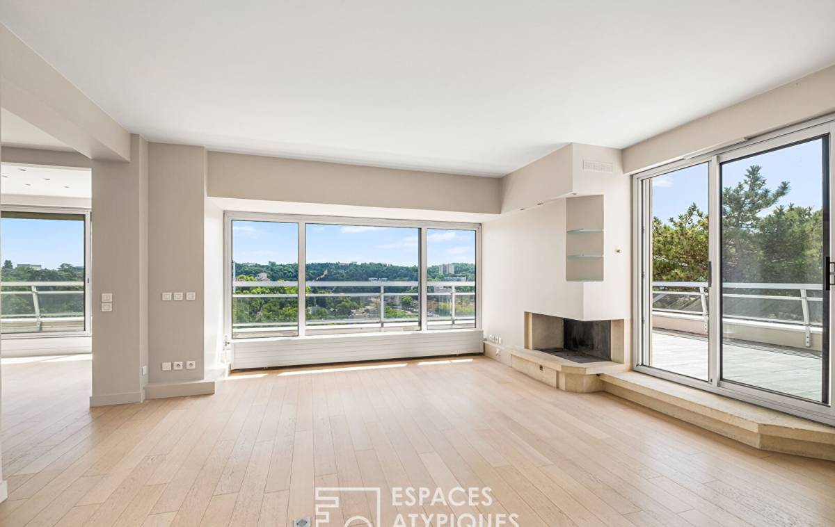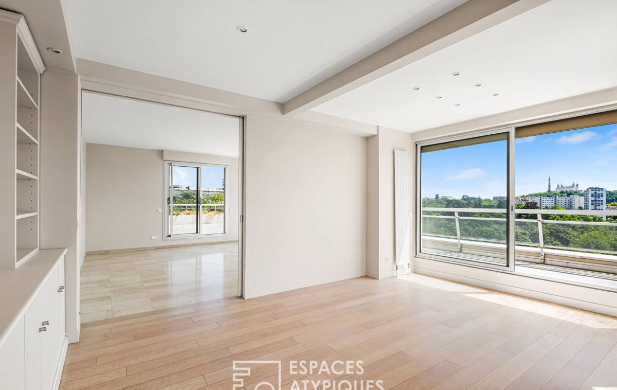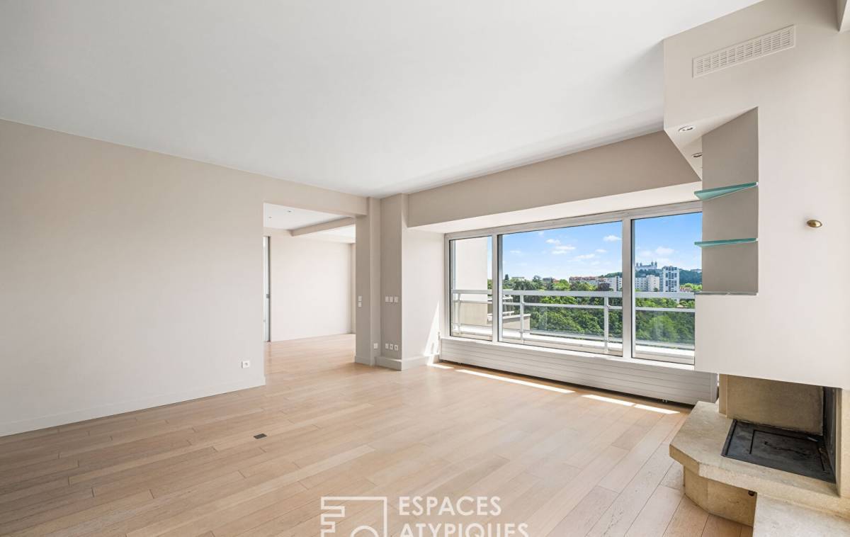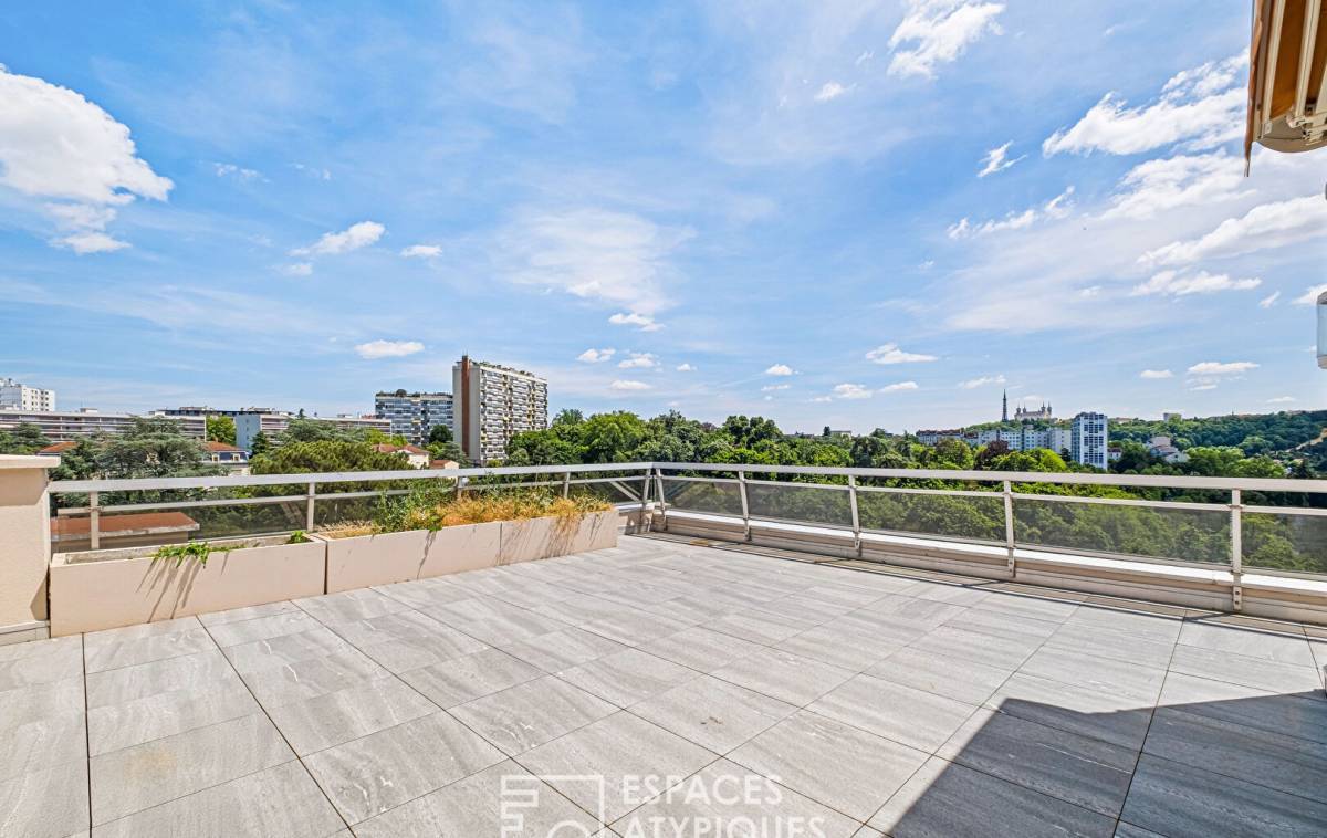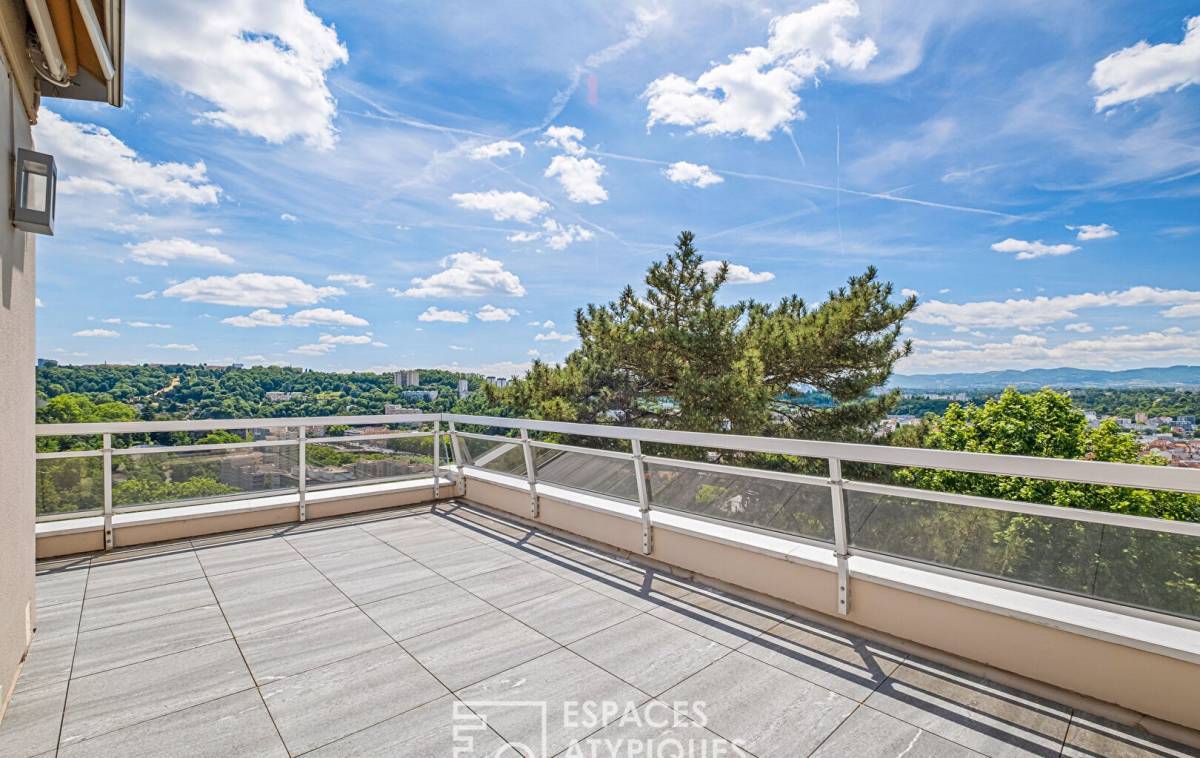 Located on the 5th and top floor of a secure luxury residence in the 4th arrondissement of Lyon, this 200sqm apartment offers a bright, calm, and privileged living environment. Featuring 80sqm of terraces facing east, south, and west, this rare property benefits from a panoramic view of the Monts du Lyonnais and the Fourvière Basilica, without any vis-à-vis. Upon entering, a hall with storage leads to a separate kitchen opening onto the terrace, a living room with a fireplace and bathed in light thanks to its large bay windows, as well as a spacious dining room. A second living room extends the reception areas and also opens onto the exterior. The whole reveals generous volumes, enhanced by a fluid circulation between the rooms and an omnipresent luminosity. The sleeping area is intelligently organized into two distinct spaces. On one side, four bedrooms, three of which have direct access to the terraces, a bathroom, a shower room with laundry room, and a separate toilet. On the other side, a master suite designed as a true independent apartment: bedroom with private shower room, toilet, dressing room and adjoining office. This property is completed by two cellars, two outdoor parking spaces and a closed garage. The terraces, with multiple exposures, pleasantly extend the living spaces and offer a striking panorama of nature and Lyon's heritage. Quiet residential environment, close to schools, shops, transport and roads allowing quick access to the city center, a confidential address for a rare and functional property. Property subject to the status of co-ownership: 252 lots, including 86 residential lots ENERGY CLASS: E / CLIMATE CLASS: E Estimated average amount of annual energy expenditure for standard use, established from energy prices for the year 2021, 2022, 2023 (Diagnostics established on 02/12/2025) - ?