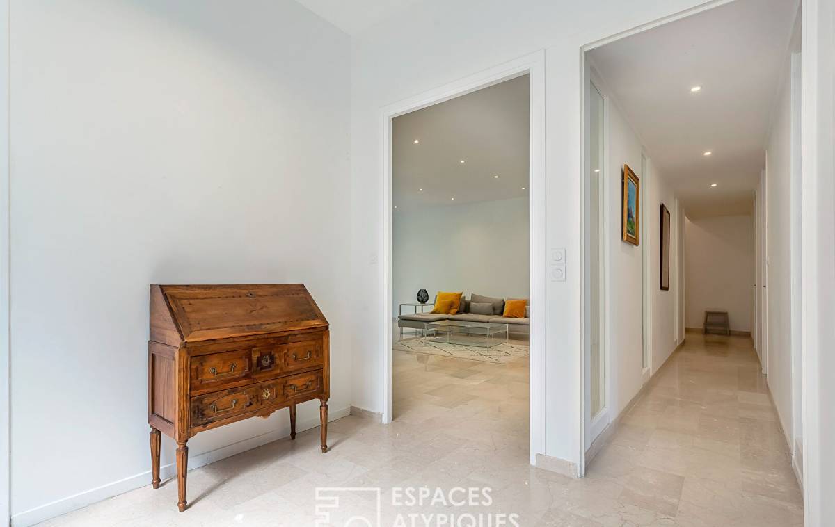 In the heart of the highly sought-after 6th arrondissement, just steps from the Parc de la Tête d'Or, this unique apartment sits atop a 1920s mansion, elegantly elevated to accommodate a vast, contemporary living space.