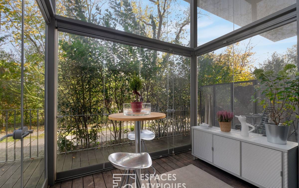 A WC and a laundry room complete the ground floor, which benefits from underfloor heating and external blinds for optimal light control. The upper floor comprises a landing that could serve as an office, a bathroom with a bathtub, two bedrooms with built-in wardrobes, and a master bedroom with its own shower room and ample storage. The layout of this duplex makes it ideal for family living. Outside, the terrace seamlessly extends the living room and offers a rare green space in the city. The residence's green spaces and the surrounding 2-hectare park provide a peaceful and verdant setting.