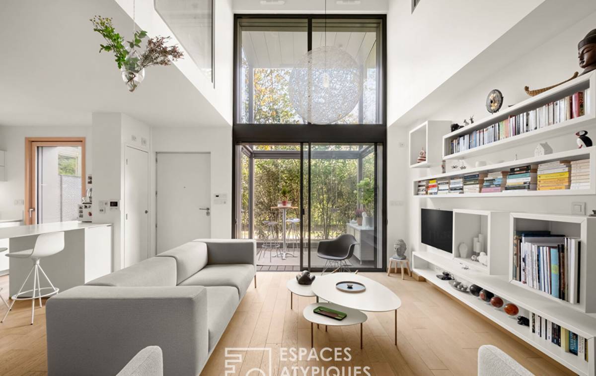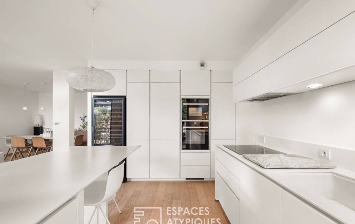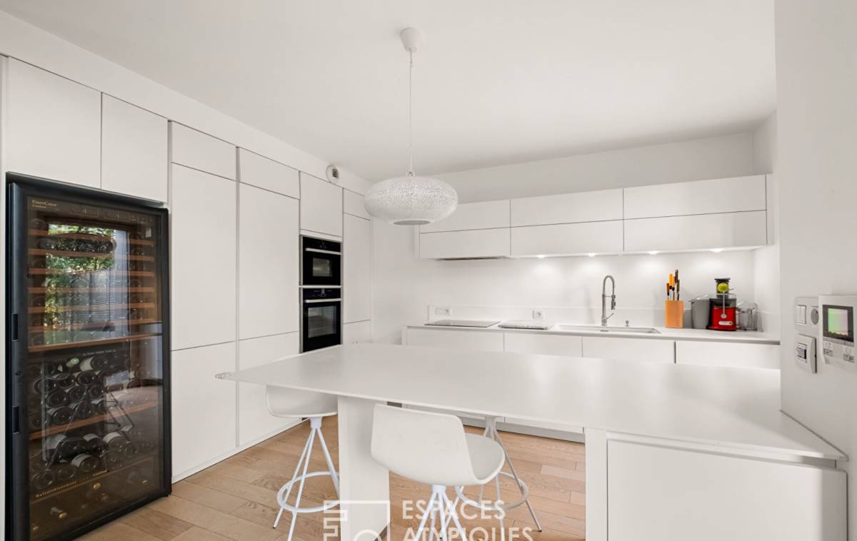 The entrance reveals an interior designed for comfort and flow. The contemporary, fully open-plan kitchen blends seamlessly with the living and dining areas thanks to its minimalist and elegant layout. Large bay windows provide remarkable ceiling height and flood the entire space with natural light.