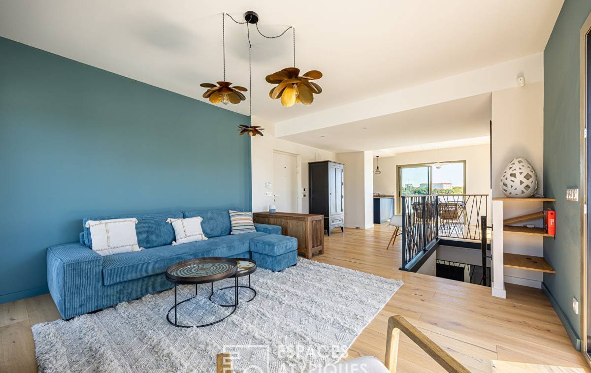 The entrance leads to a large living room with a kitchen open to the bright living room giving access to a 45sqm terrace. The lower level is composed of two bedrooms, one of which has access to a 4sqm balcony, sharing a bathroom and a separate toilet. A 19sqm hallway houses an office that could become a 3rd bedroom.