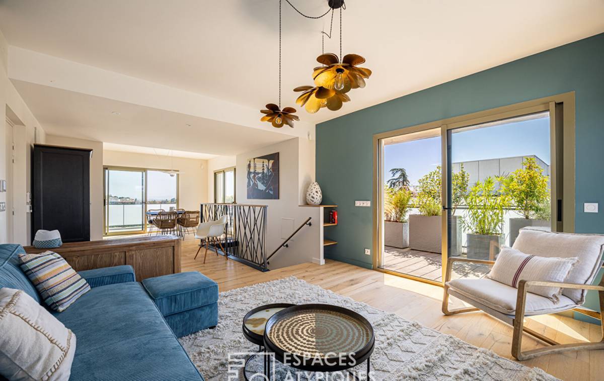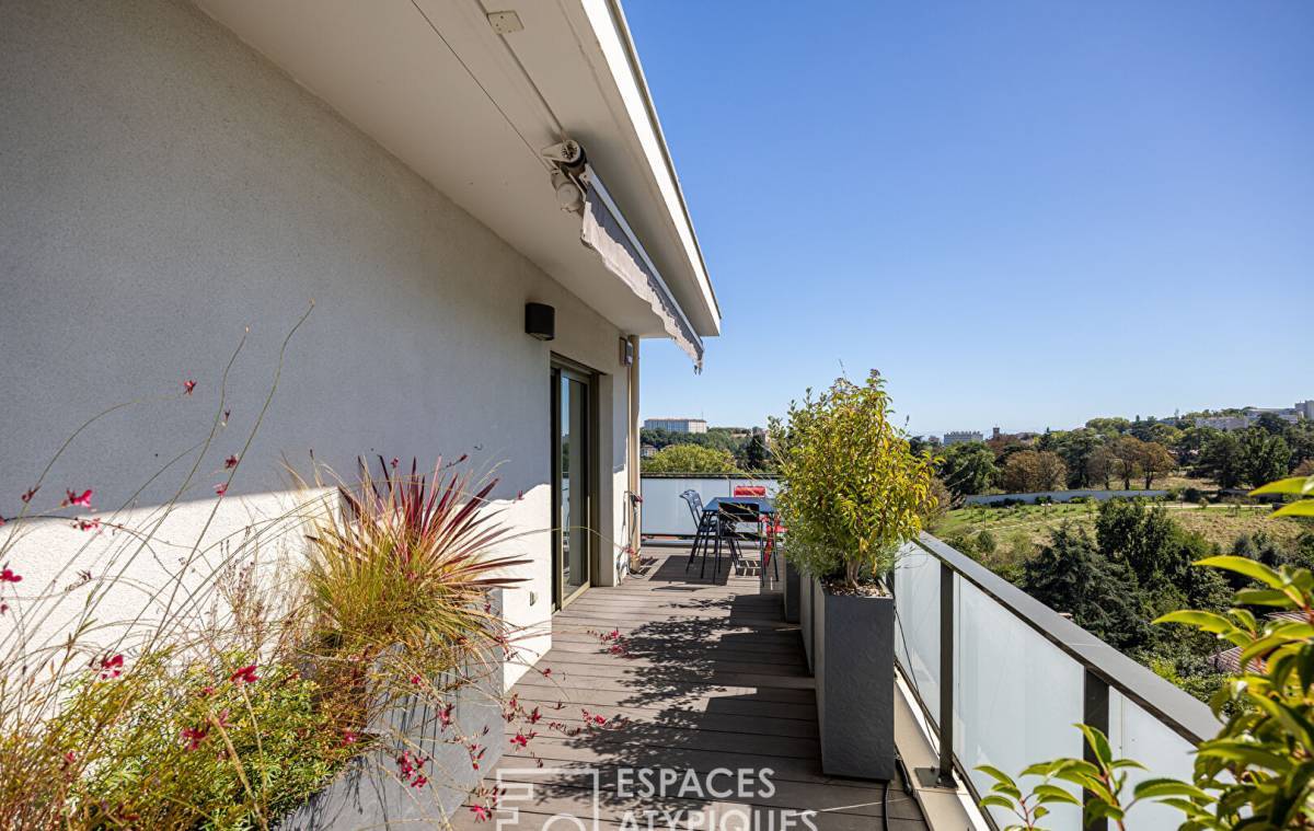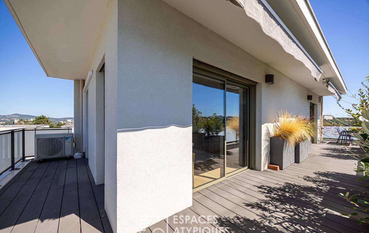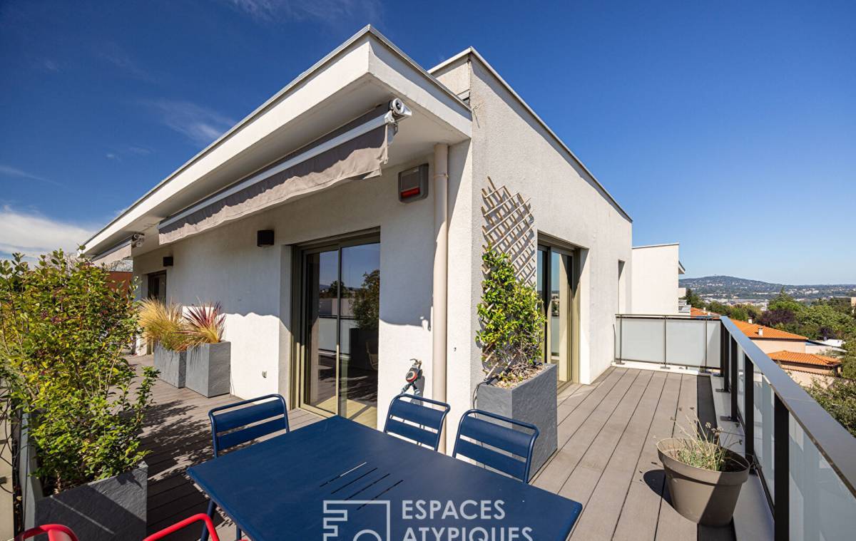 Located in the sought-after Point du Jour district of Lyon 5th, this 140m2 duplex apartment with a 45m2 terrace and breathtaking views of the Fourvière Basilica is located on the top floor of a recent building.