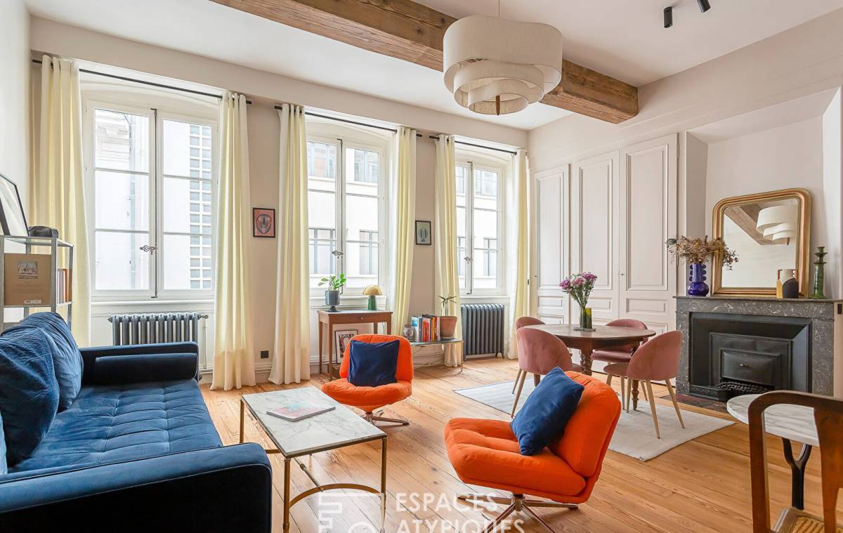 Ideally located in the prestigious Grôlée district, just steps from the Basilique Saint-Bonaventure in Lyon's 2nd arrondissement, this 89 sqm (Carrez law) apartment sits on the 3rd floor (with elevator) of a beautifully maintained bourgeois building.