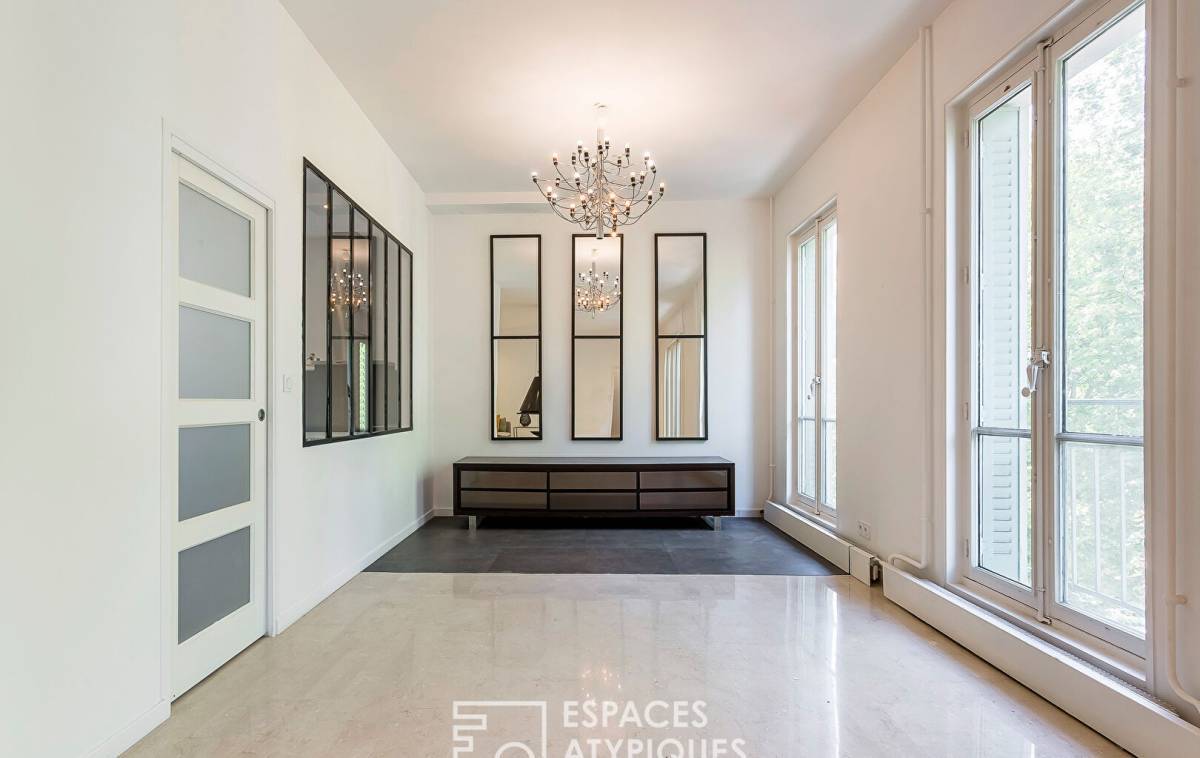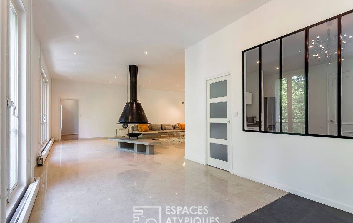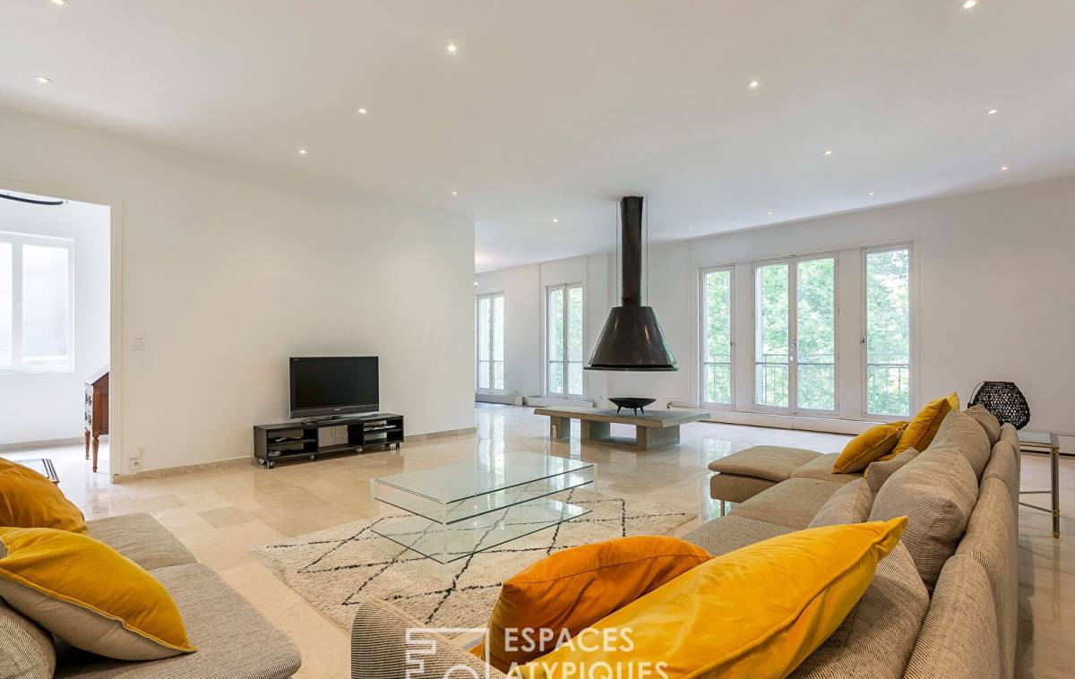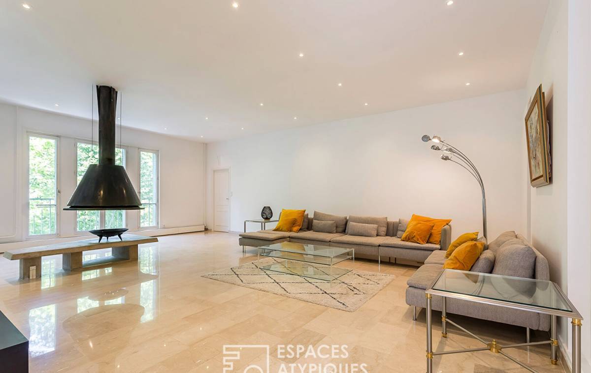 In the heart of the highly sought-after 6th arrondissement, just steps from the Parc de la Tête d'Or, this unique apartment sits atop a 1920s mansion, elegantly elevated to accommodate a vast, contemporary living space.