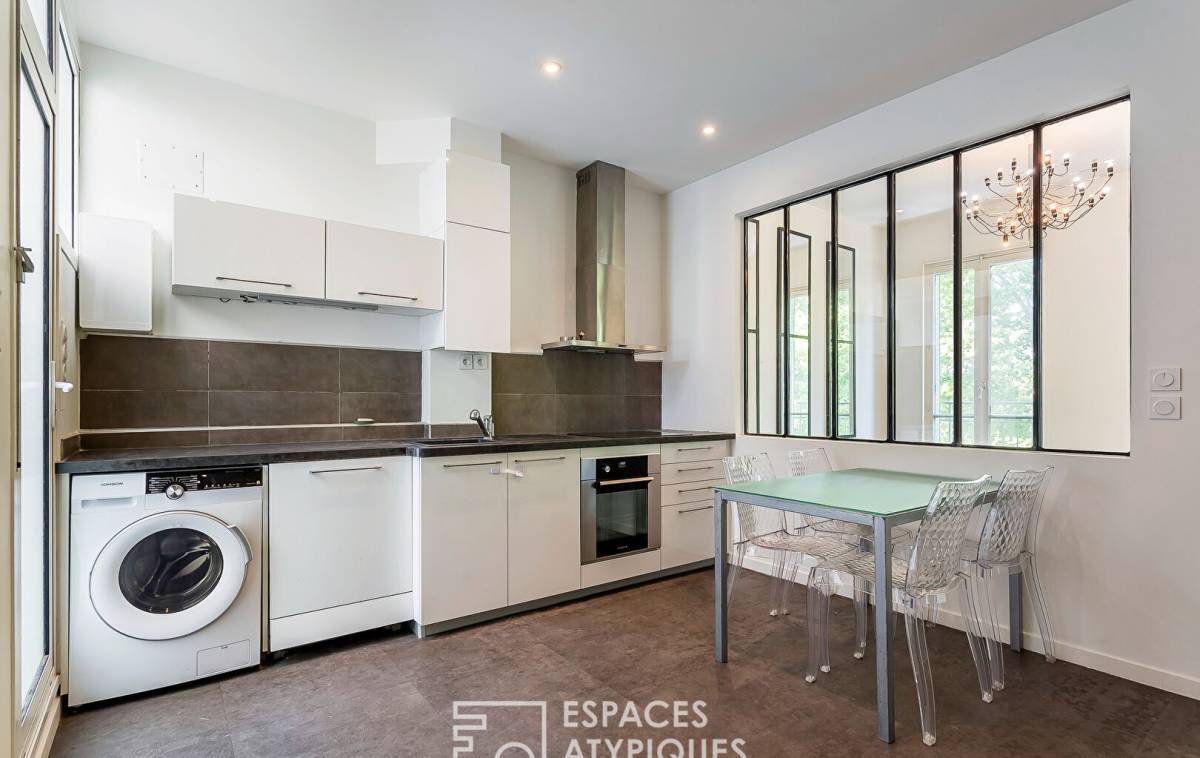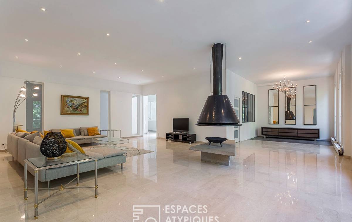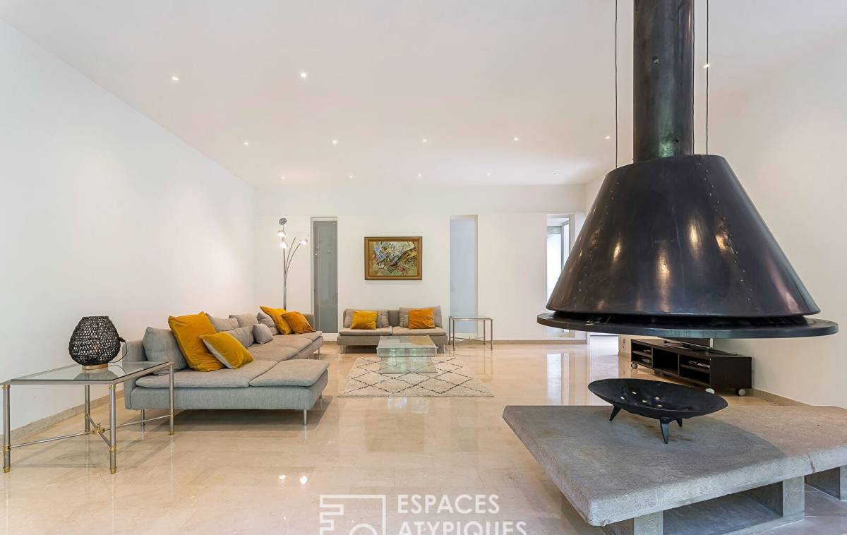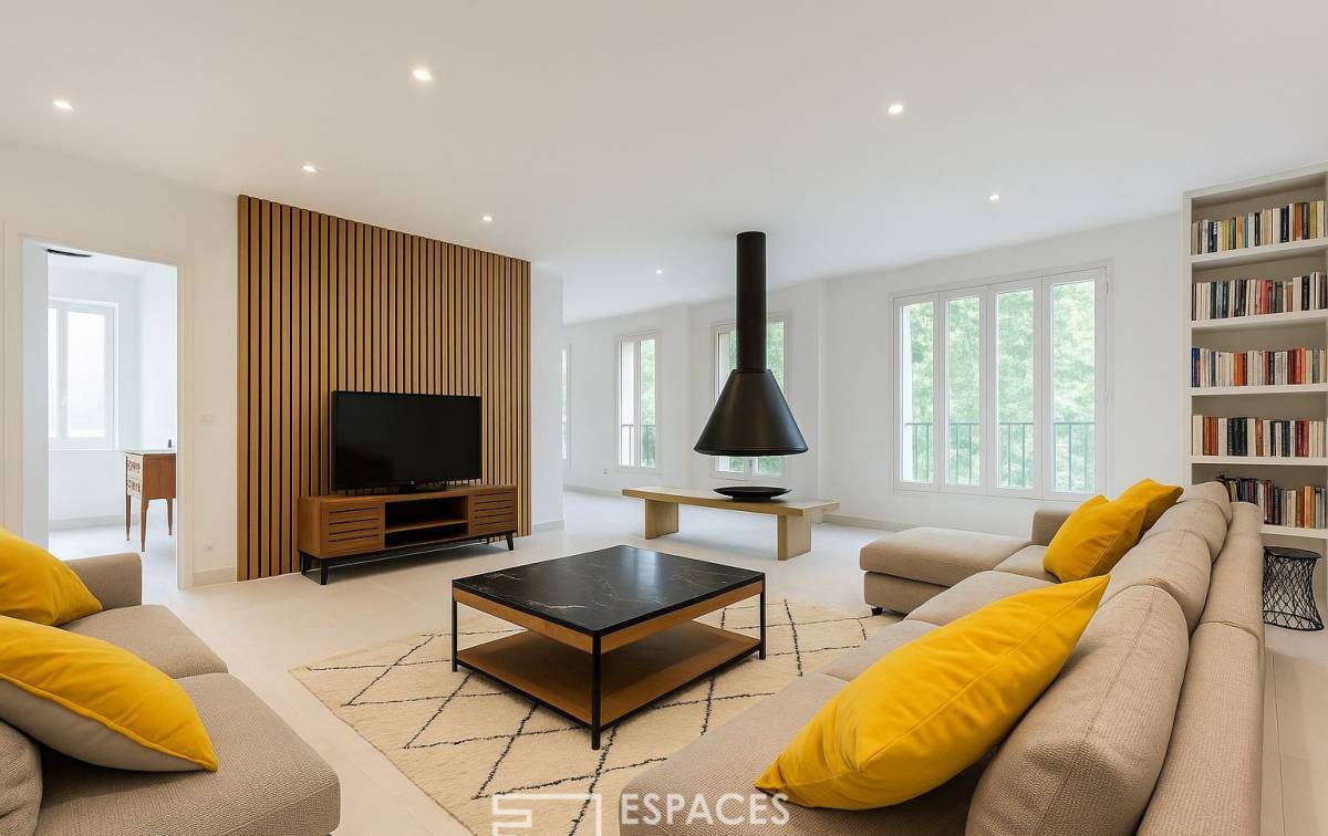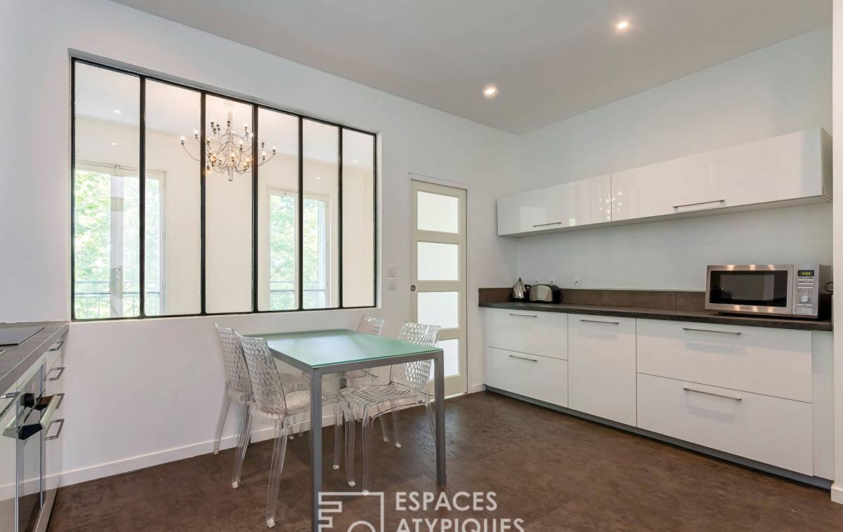 In the heart of the highly sought-after 6th arrondissement, just steps from the Parc de la Tête d'Or, this unique apartment sits atop a 1920s mansion, elegantly elevated to accommodate a vast, contemporary living space.