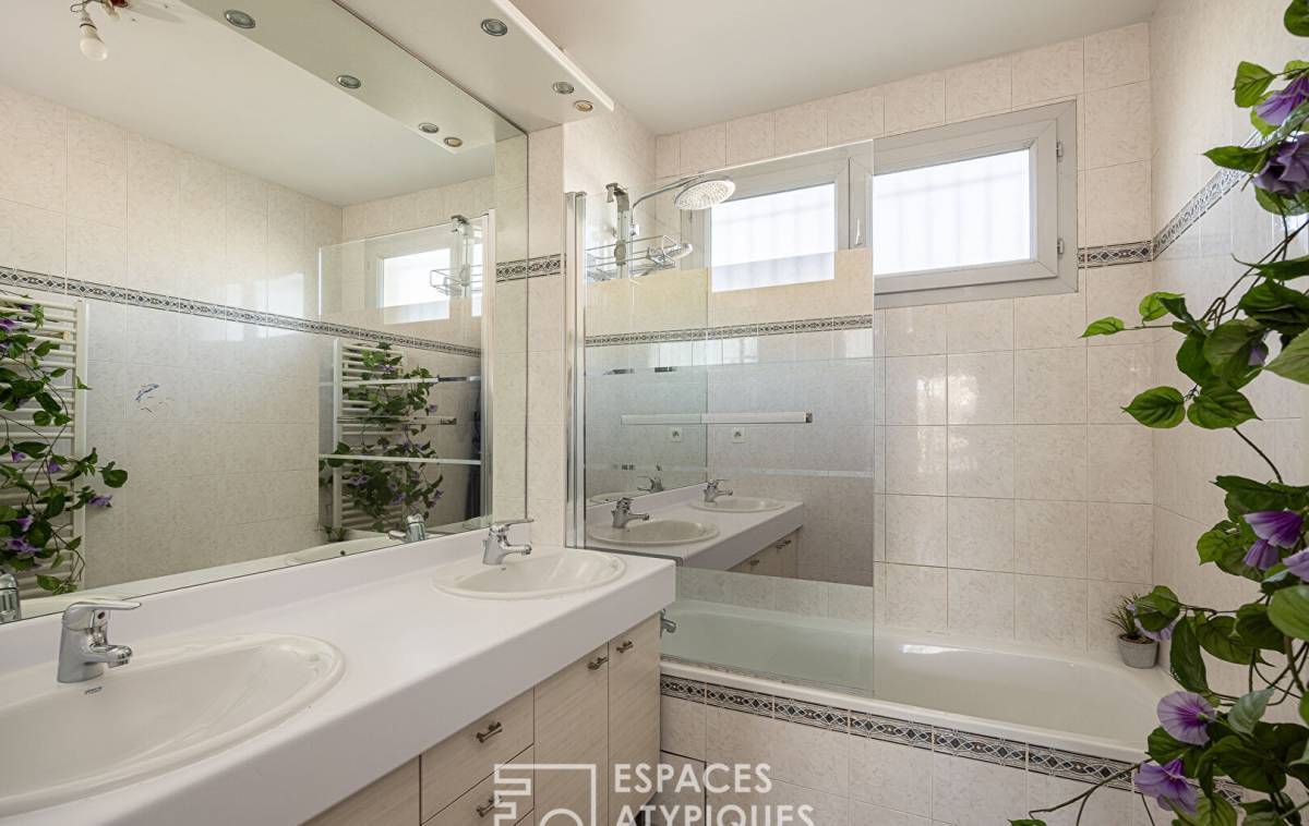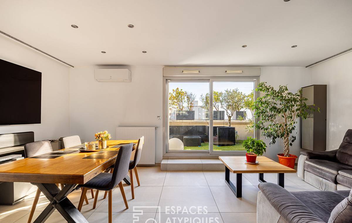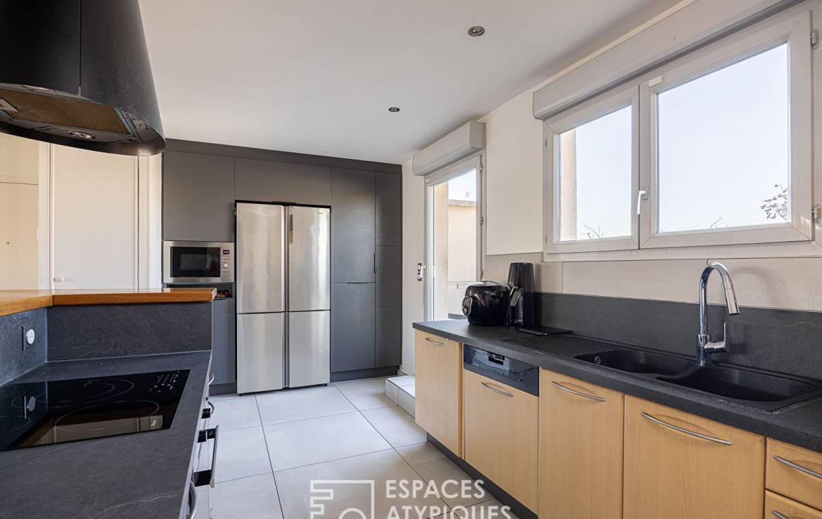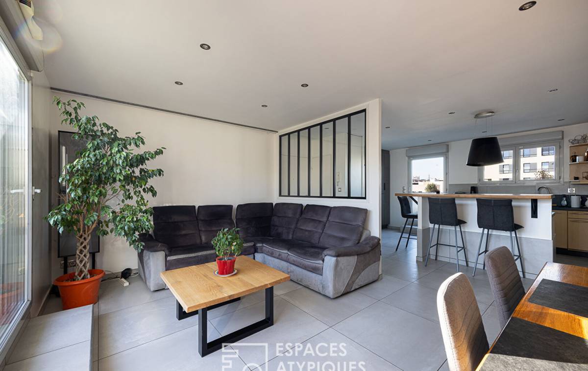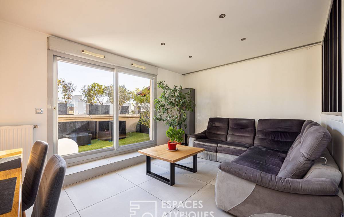 The 43 sq m north-facing terrace, also landscaped, offers exceptional panoramic views of the Fourvière Basilica, presenting a constantly changing vista throughout the day.