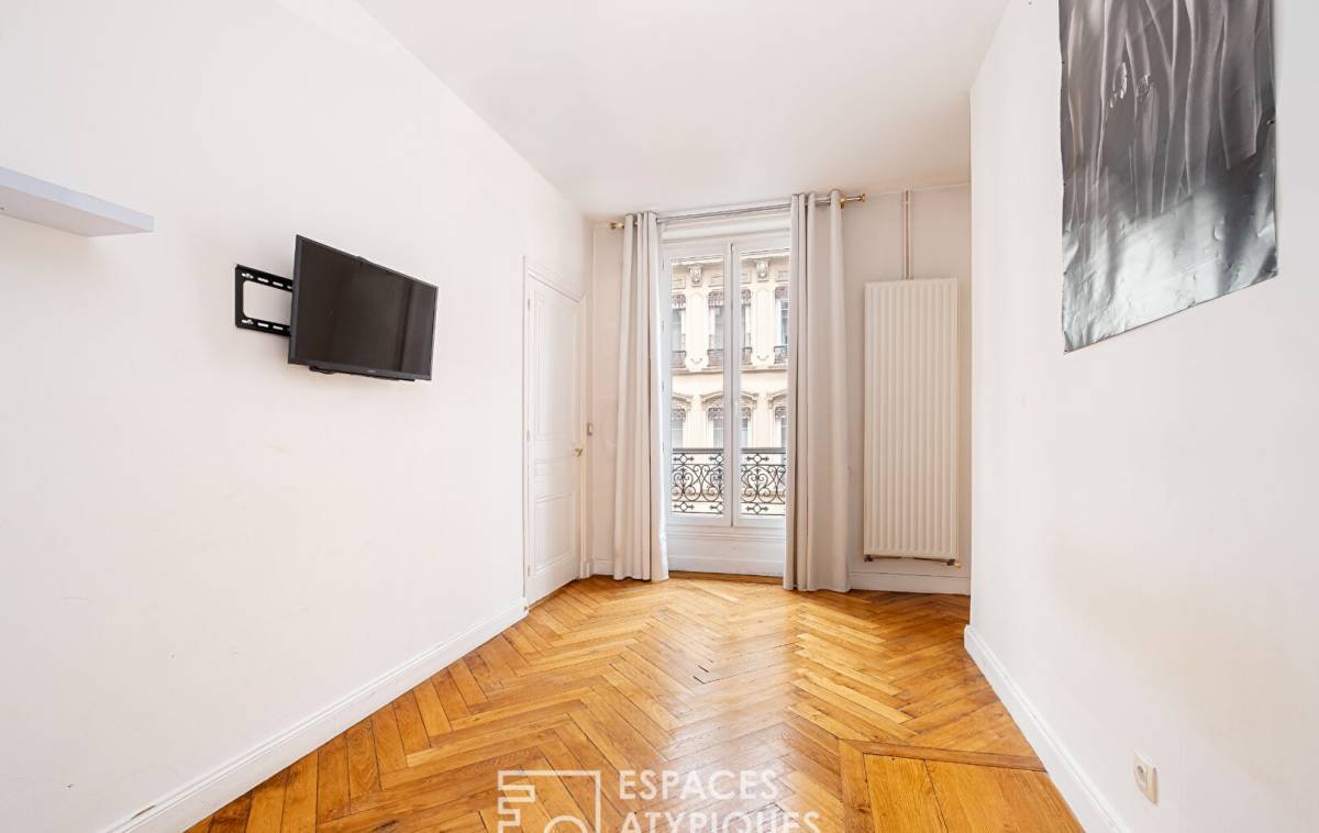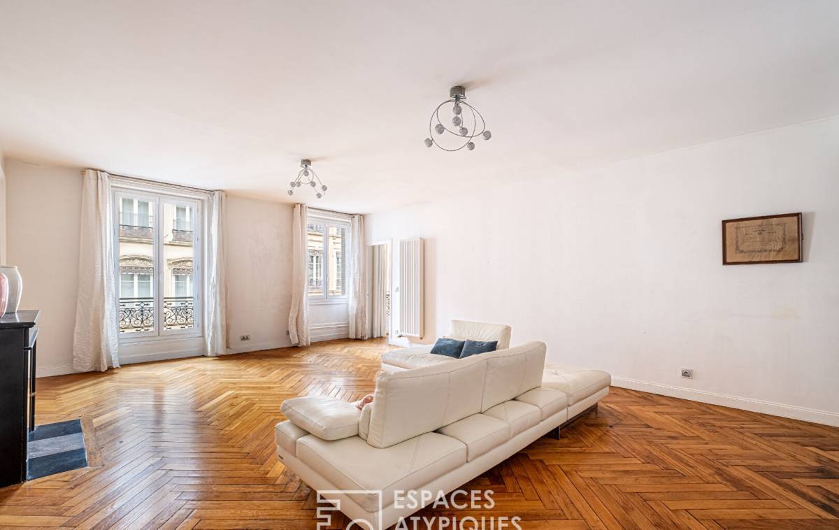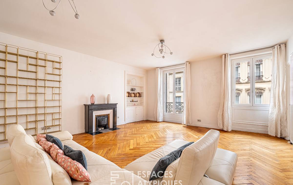 Located in one of the most sought-after neighborhoods in the 2nd arrondissement, this address seduces with its immediate proximity to all amenities and its preserved tranquility. A stone's throw from the Cordeliers metro station, this property perfectly combines calm and dynamic city life. Nestled on the third floor with elevator of a superb bourgeois condominium recently renovated in its entirety (roof, facade, common areas), this two-bedroom apartment offers 88 sqm of authentic charm. From the entrance, the tone is set: generous volumes, high ceilings, period fireplaces, and old parquet floors harmoniously interact with the light. The living room, with its beautiful openings, constitutes a truly warm reception area. Two comfortable bedrooms, two bathrooms, and a toilet complete the ensemble. A light refresh is expected, offering the opportunity to reveal the full potential of this place and personalize it to your image. The rare combination of a luxury building, a sought-after location, an elevator and a character apartment make this a unique opportunity in the area. Dual purpose A cellar Parking in the immediate vicinity Annual charges: EUR1,200 ENERGY CLASS: E / CLIMATE CLASS: B Estimated average annual energy costs for standard use: between EUR1,730 and EUR2,400