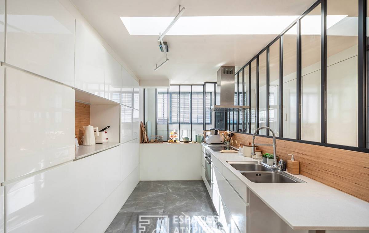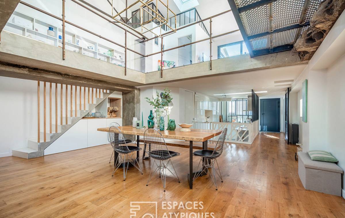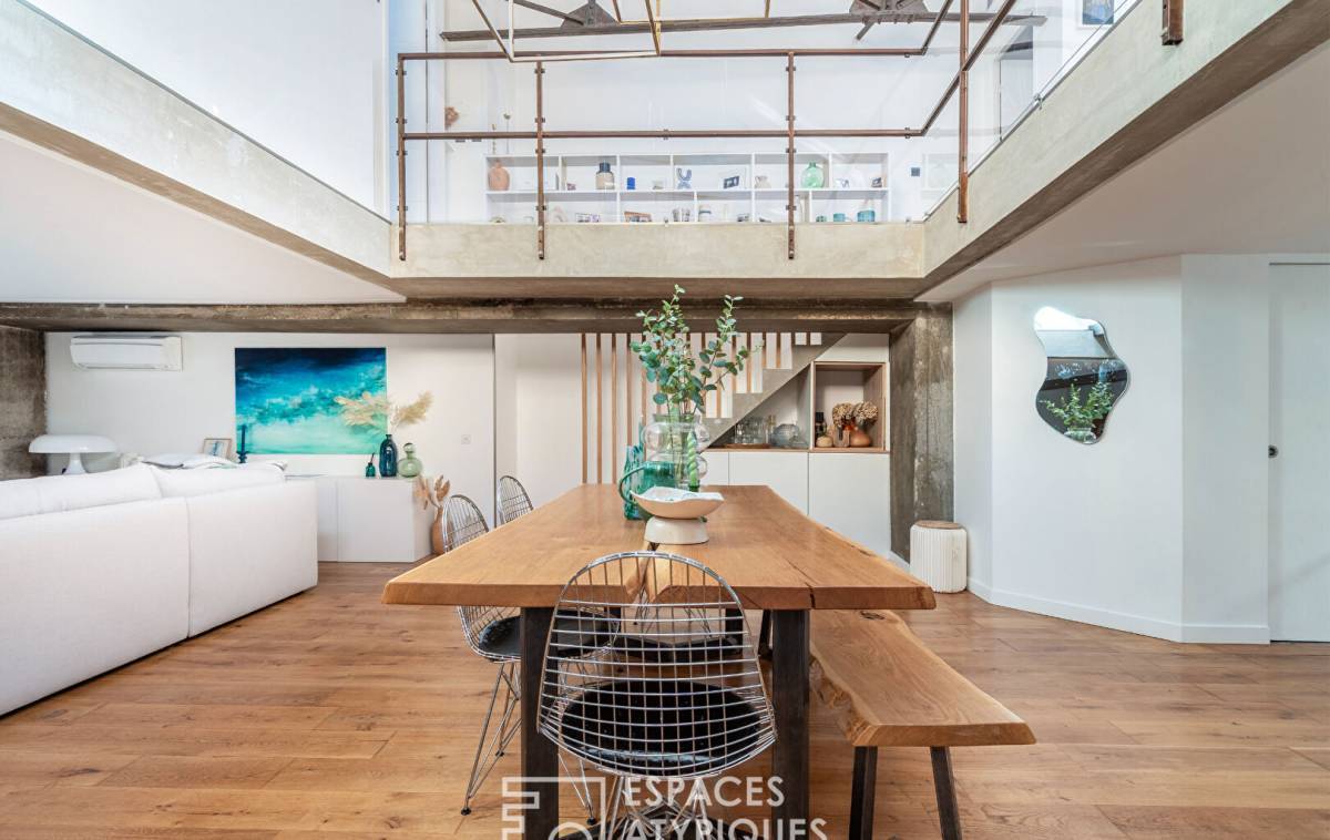 The kitchen, measuring over 11 m², fully equipped and featuring numerous built-in units, opens onto the dining room, the true heart of the loft. This room impresses with its 6-meter ceiling height thanks to an extraordinary ceiling opening.