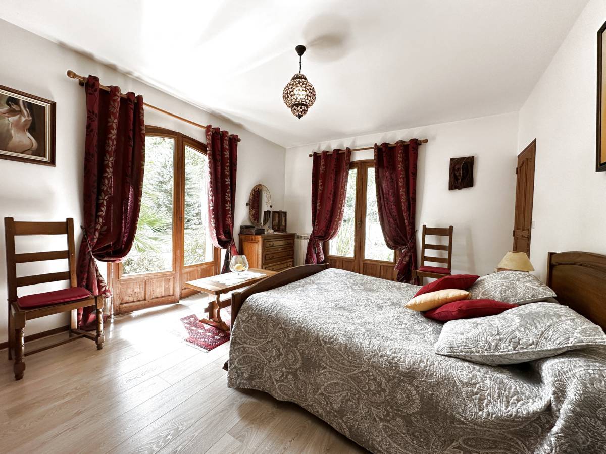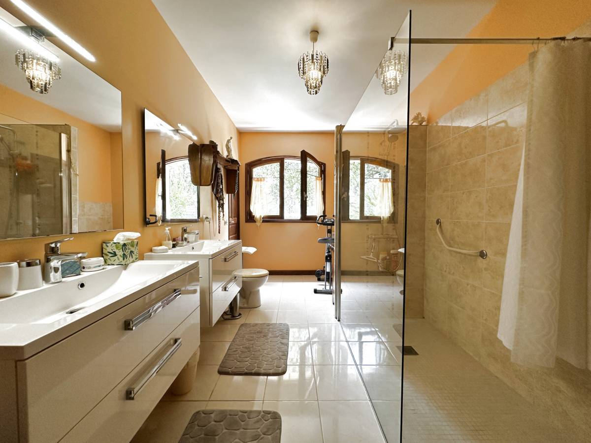 Upstairs, two additional bedrooms, one with a solarium, shower, and toilet. Two large adjoining garages are perfect for storing vehicles or creating a workshop. A third, independent 25 m2 garage is ideal for a classic vehicle.