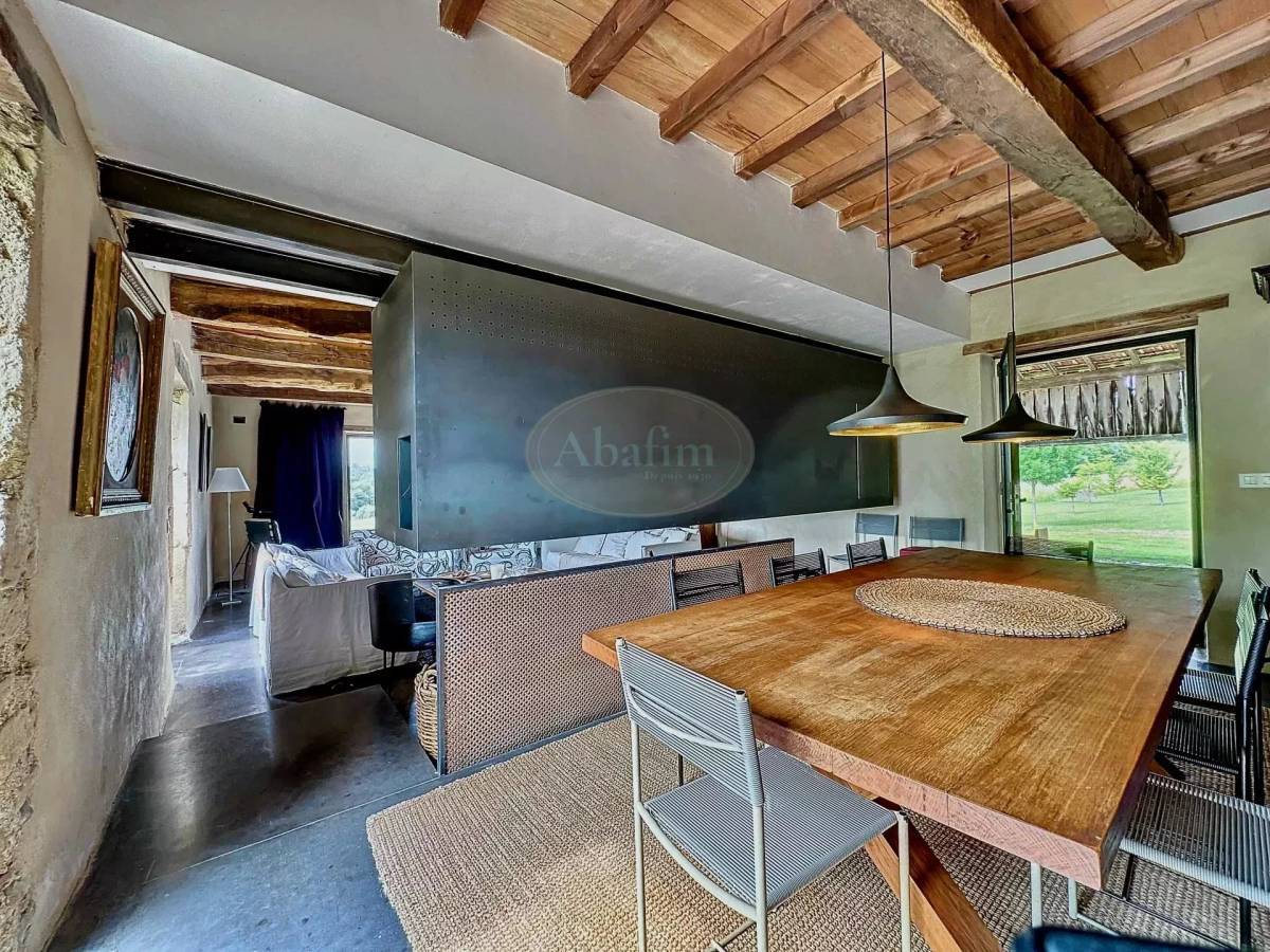 Two steps lower is the cosy sitting room, 34m², separated by the living room and kitchen by a grand metal fireplace open to both rooms. The flooring is waxed cement with built-in heating. Several patio doors open to the lovely terraces, open and covered, facing east, south and west and offering shade or sun all day long.