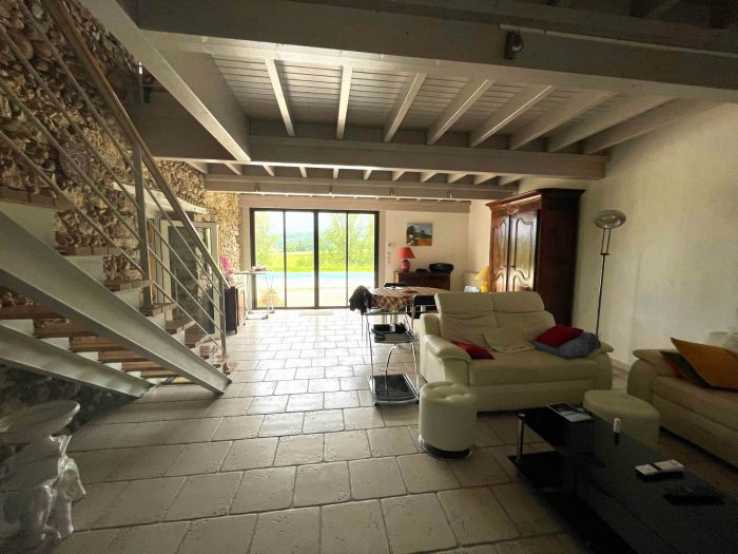 Superb property comprising a stone house 202m2, adjoining a very large garage/workshop 75m2, non-adjoining outbuildings on more than 5ha (mown by a neighbour without contract, land therefore free). Views of the countryside and Pyrenean foothills. Well and swimming pool.