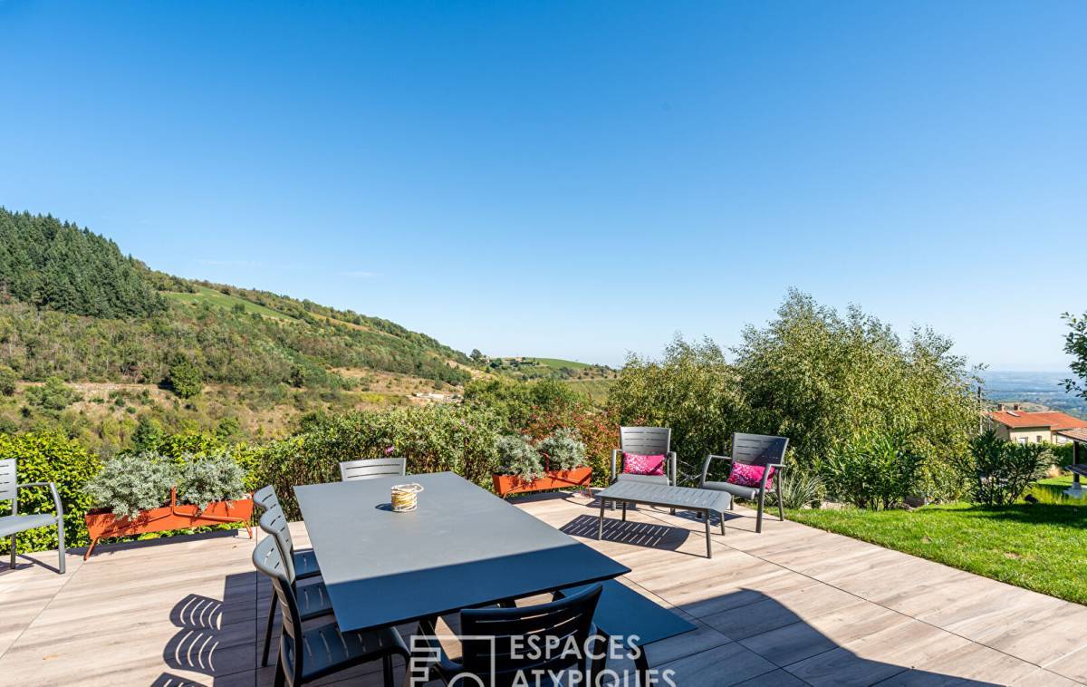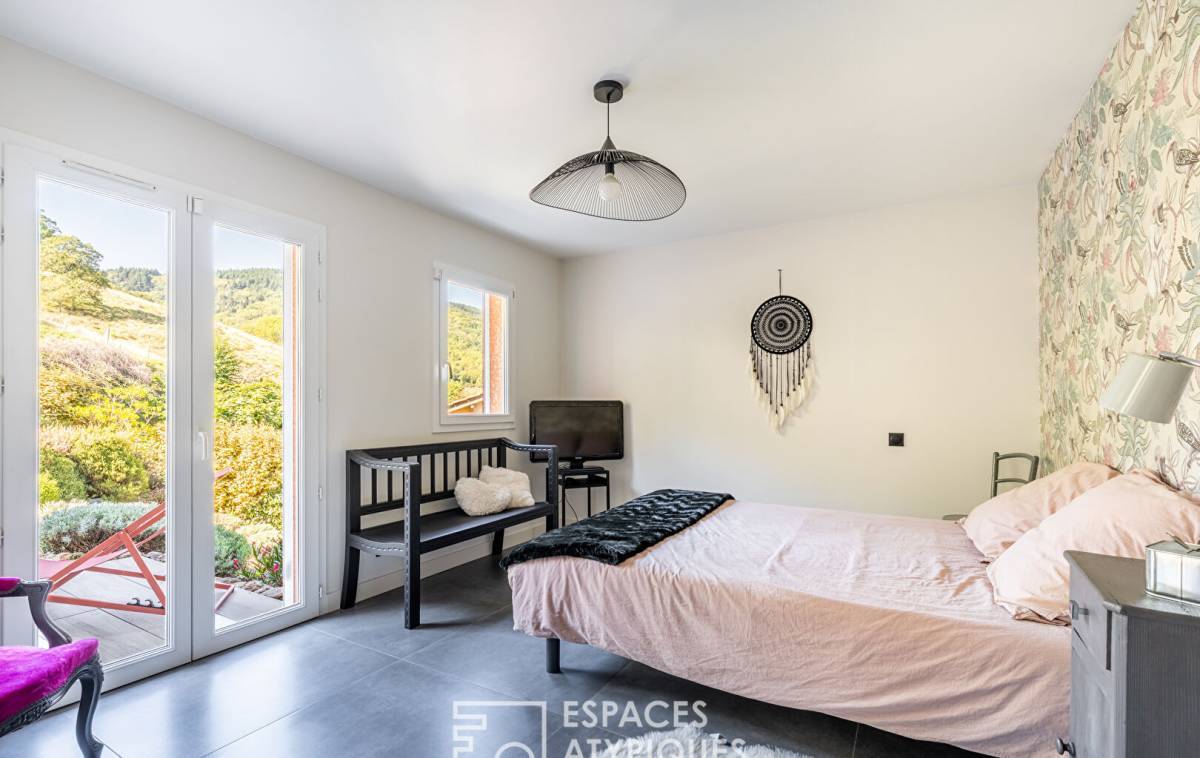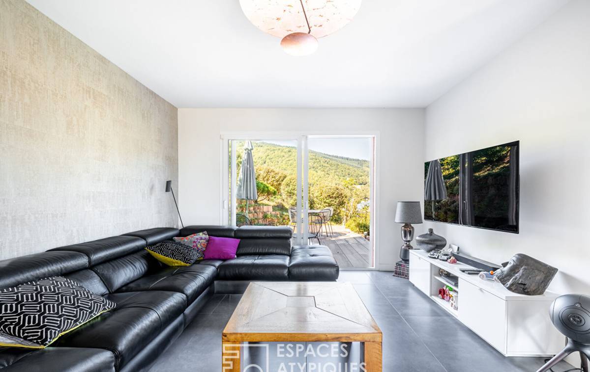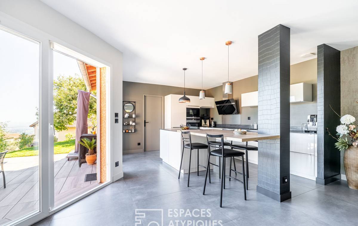 Upon entering, the vast cathedral-style living room captivates with its airy atmosphere. Bathed in light thanks to large bay windows, it opens onto a generous terrace, a veritable balcony suspended over the surrounding hills.