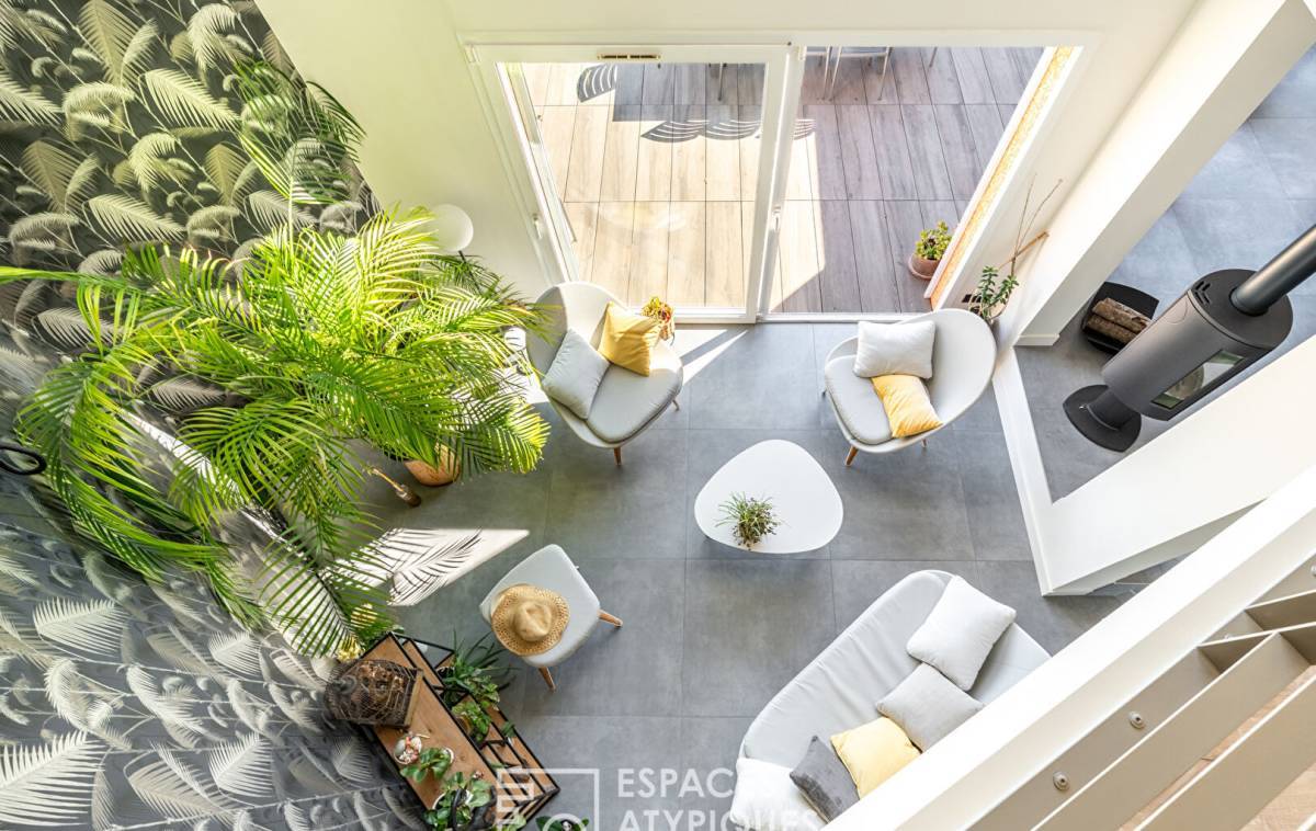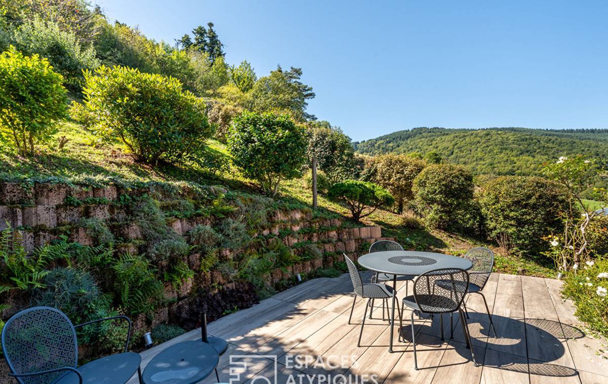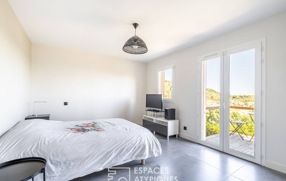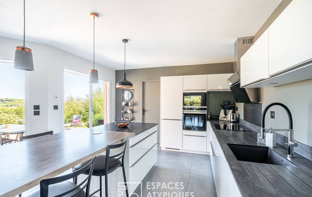 Upon entering, the vast cathedral-style living room captivates with its airy atmosphere. Bathed in light thanks to large bay windows, it opens onto a generous terrace, a veritable balcony suspended over the surrounding hills.