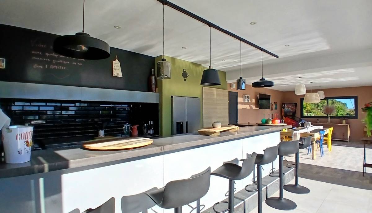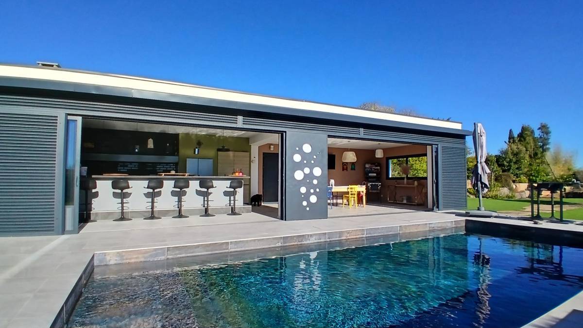 Unique ! A magnificent contemporary villa of exceptional quality, combining refinement, comfort and modern elegance. Built in 2020 on one level, this remarkable home offers 220 m2 of living space featuring a vast, light-filled living area of over 75 m2 with a fully fitted designer kitchen, 4 bedrooms (including a superb master suite with dressing room and private bathroom), 2 bathrooms, a utility/laundry room and an impressive spa room with a large swim spa jacuzzi. Set within beautifully landscaped and perfectly maintained grounds of 1570 m2, the property also boasts a south-facing Bali stone swimming pool, a stunning 60 m2 summer kitchen, a bioclimatic pergola, a carpe koi pond with cascading waterfalls and a generous parking area at the front accommodating numerous vehicles. Exceptional features and finishes throughout. Sold fully furnished with top-of-the-range furniture and fittings. A truly rare property in a remarkably peaceful setting !