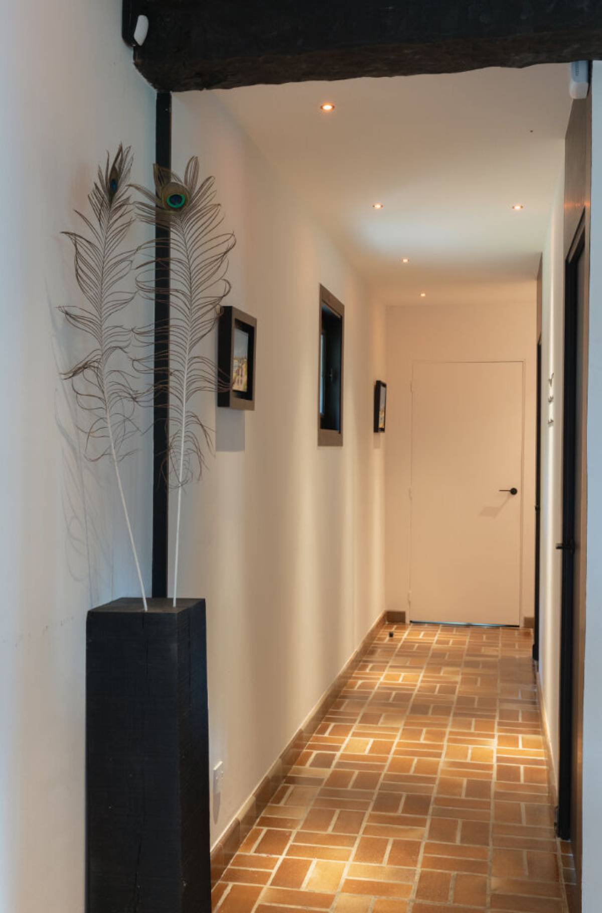 The hallway, with its carefully designed lighting, features two folding glass doors that open onto the kitchen and living room respectively, offering a clear view from the kitchen to the fireplace.
