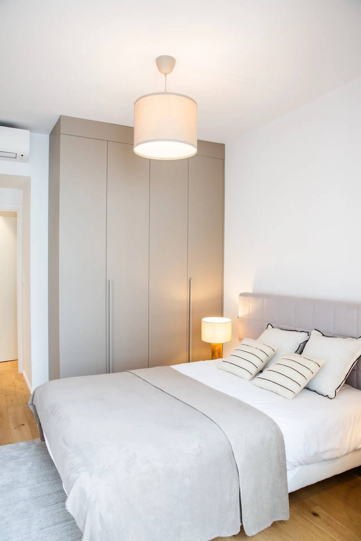 The south-facing living area, consisting of a double living room and an open kitchen, is bathed in light thanks to large bay windows opening onto a spacious terrace with unobstructed views - a rare find in the city center. The fully equipped kitchen is smartly designed around a central island, combining aesthetics and functionality.