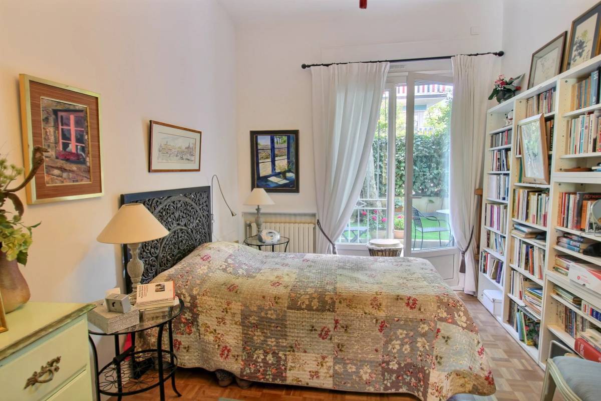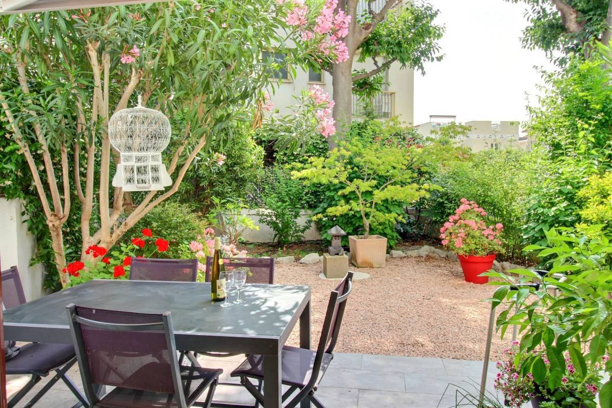 The apartment features two bedrooms, each with direct access to a second garden and private terrace. You’ll appreciate the two sunny terraces facing southeast and northwest, shaded by greenery.