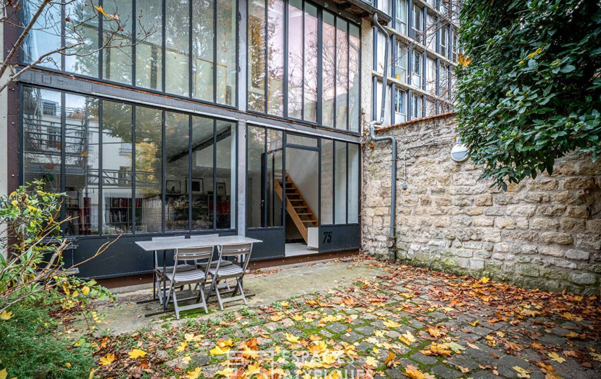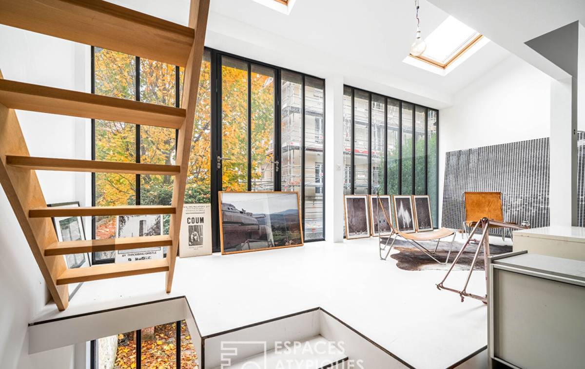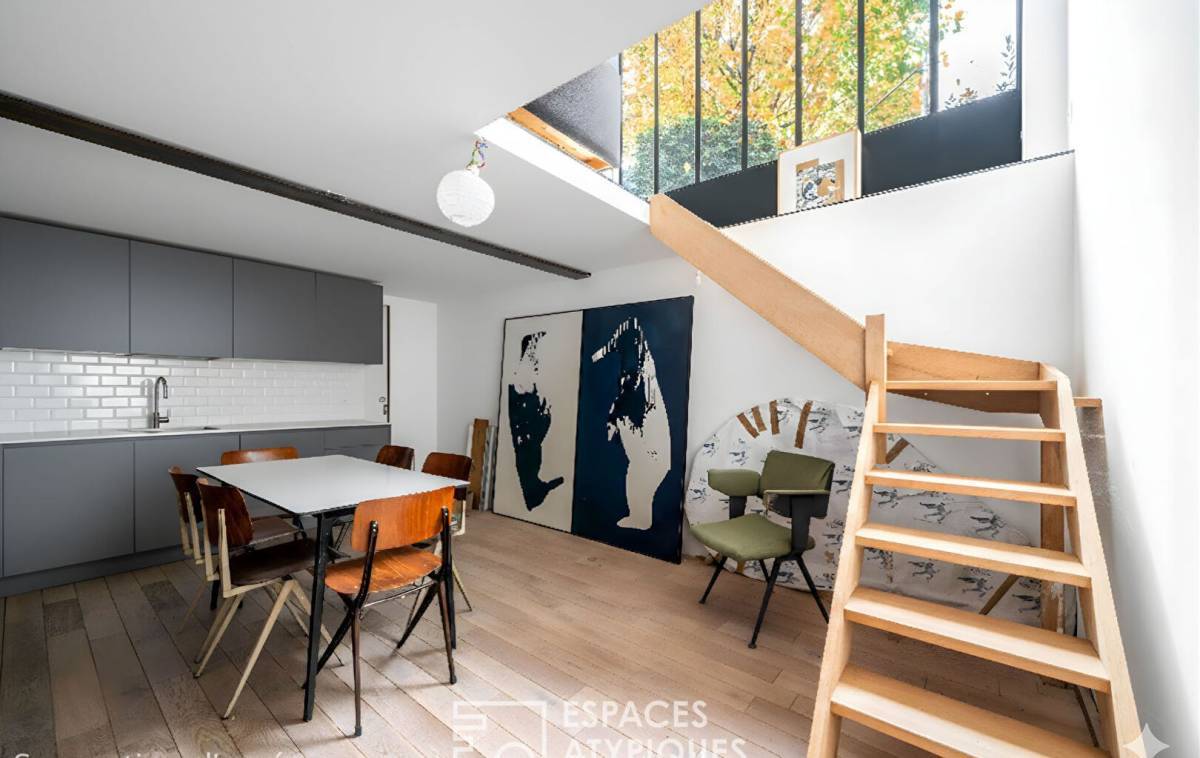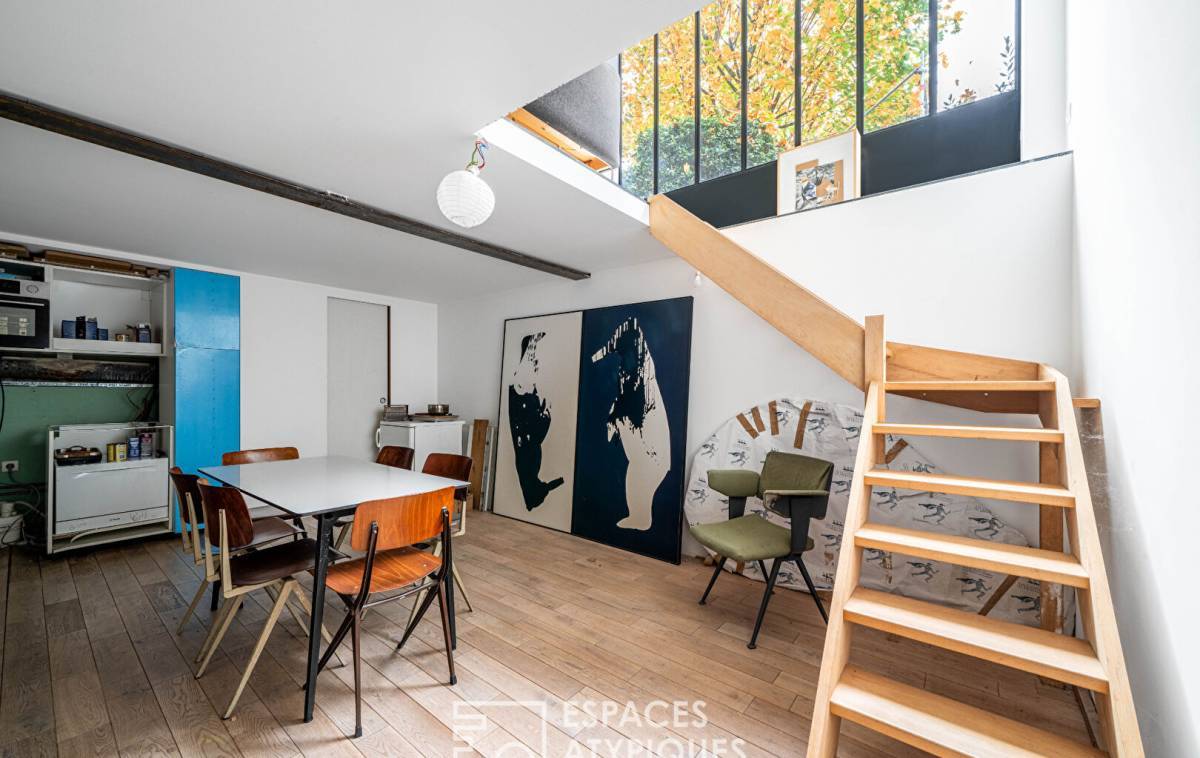 In the heart of the Croulebarbe district, opposite the iconic Mobilier National (National Furniture Collection), lies a 114 sq m (98 sq m Carrez law) house/studio, discreetly nestled at the back of a leafy courtyard. This rare property is distinguished by its multi-level architecture and its workshop-like feel, enhanced by imposing glass-roofed windows that bathe the space in constant light and offer a soothing view of the courtyard's greenery.