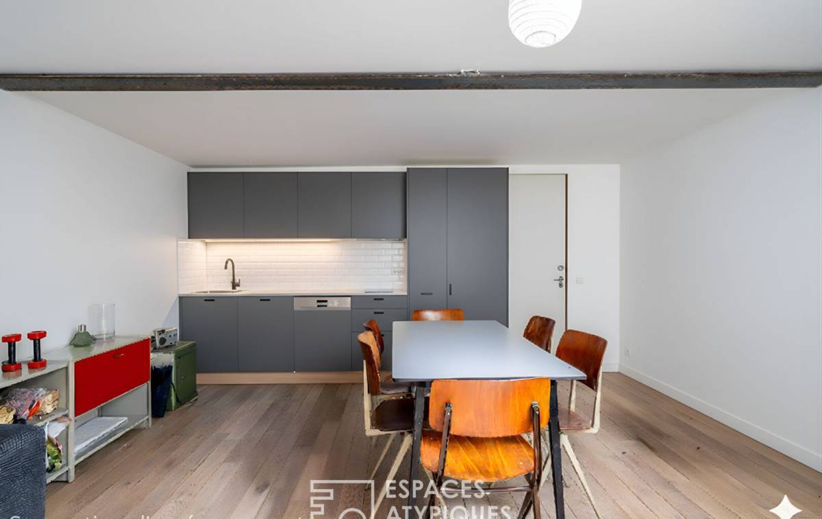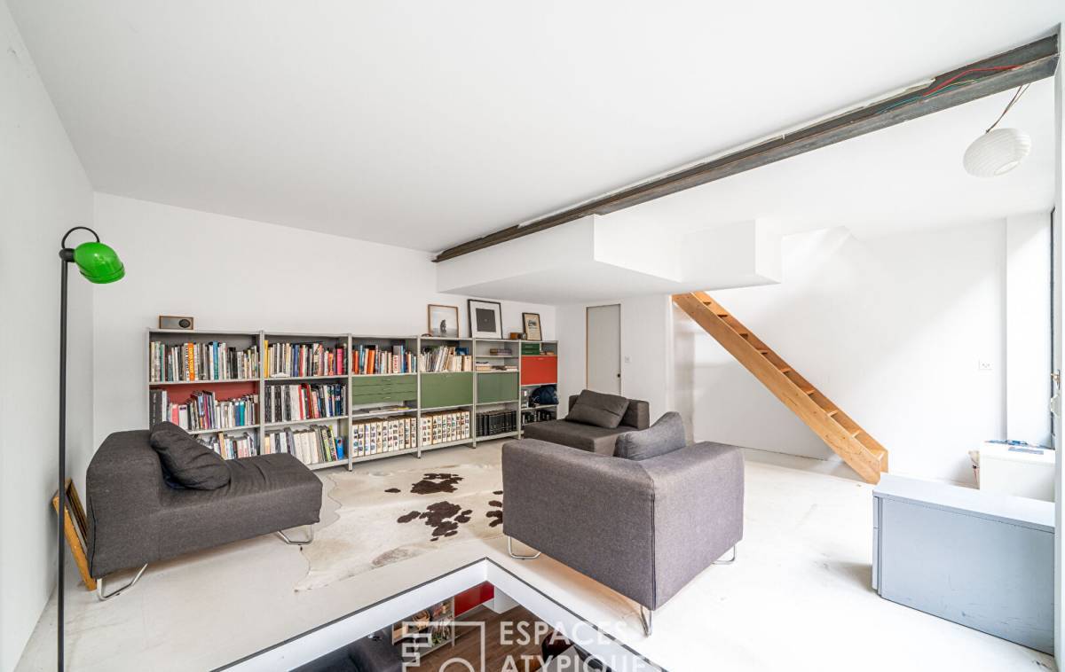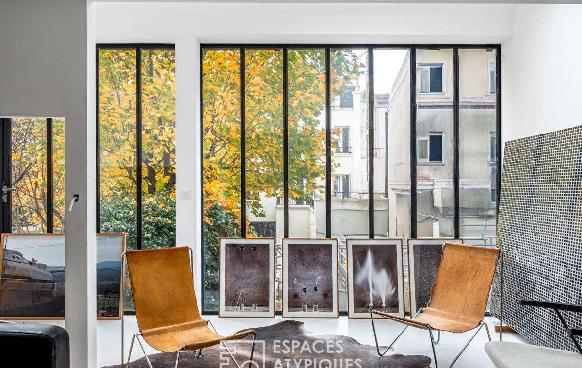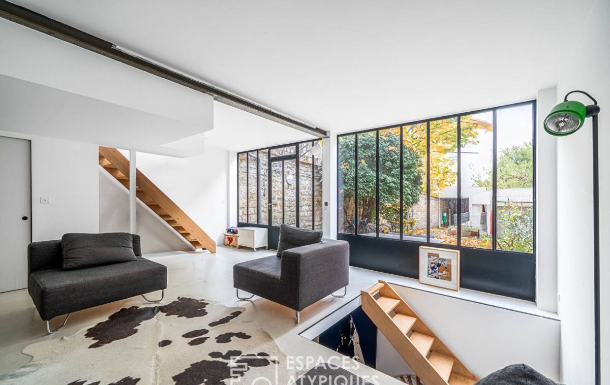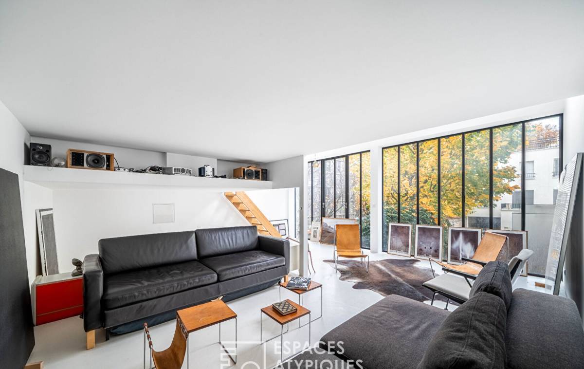 In the heart of the Croulebarbe district, opposite the iconic Mobilier National (National Furniture Collection), lies a 114 sq m (98 sq m Carrez law) house/studio, discreetly nestled at the back of a leafy courtyard. This rare property is distinguished by its multi-level architecture and its workshop-like feel, enhanced by imposing glass-roofed windows that bathe the space in constant light and offer a soothing view of the courtyard's greenery.