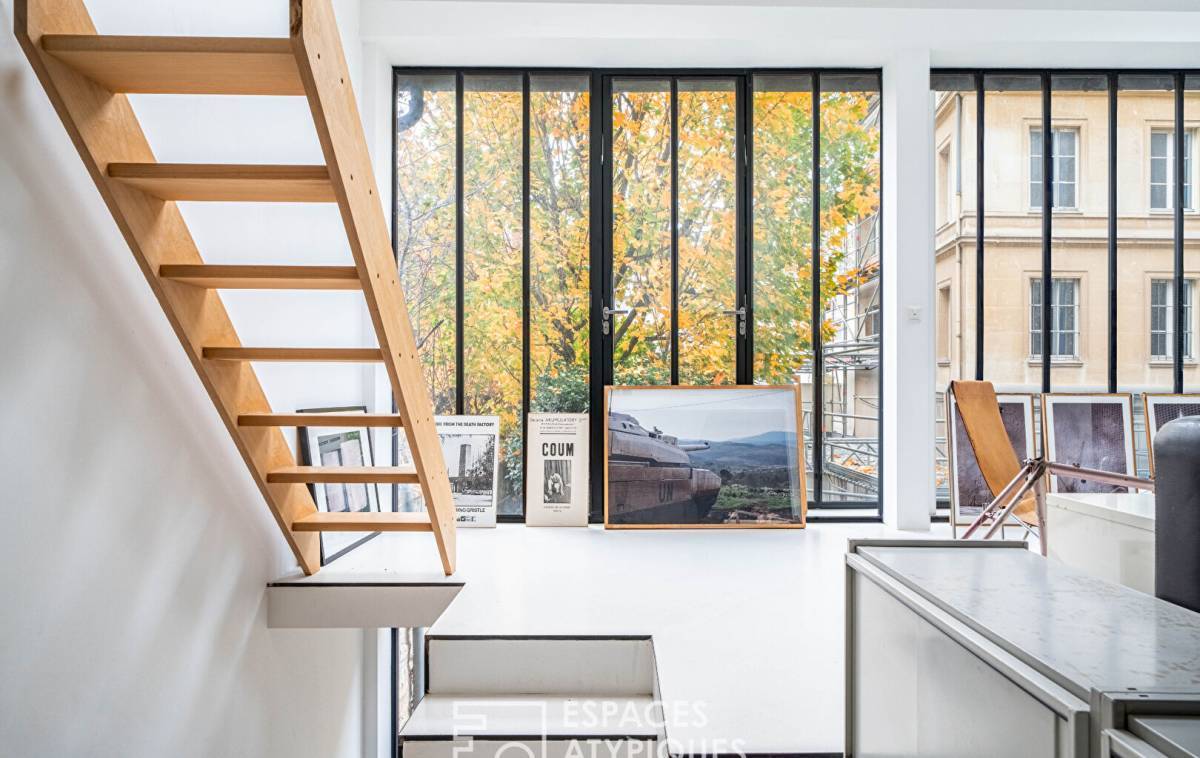 The sought-after address, the privacy of the location, the charm of the glass roof, the courtyard, and its architectural qualities make this property an opportunity to realize an exceptional project.