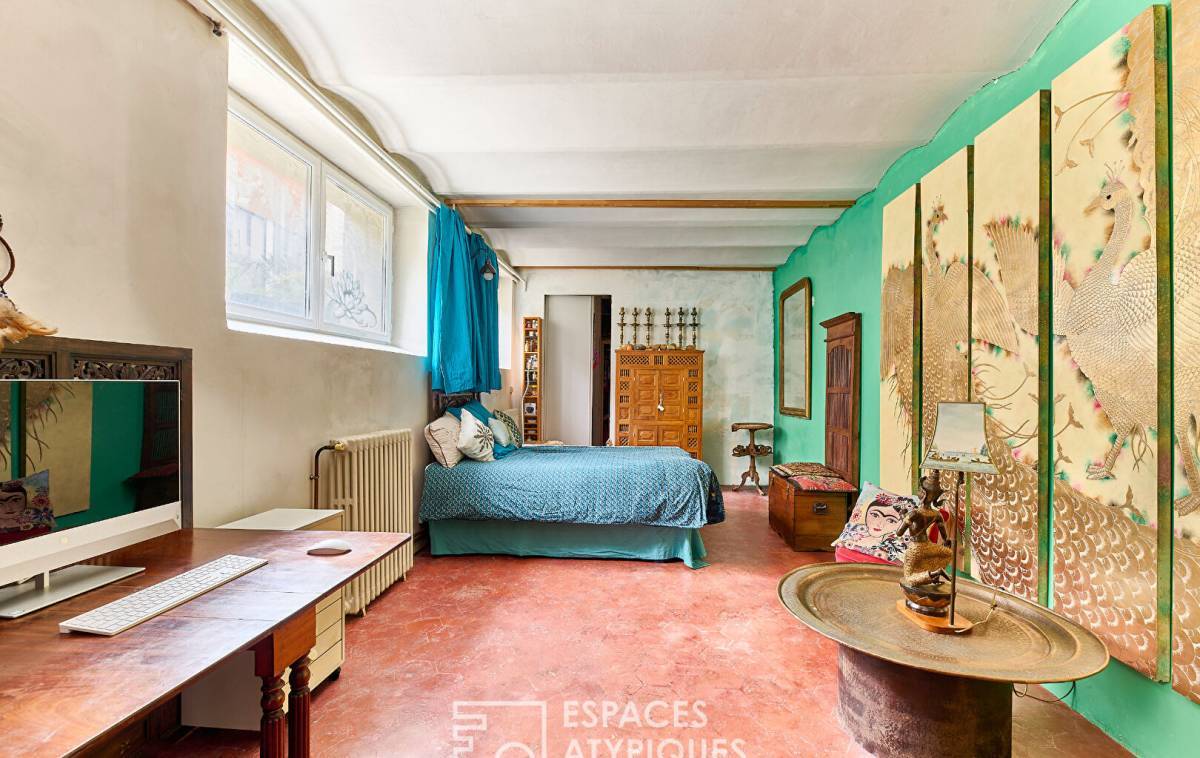 A staircase leads to the lower level of 31.5 m2, configured as a large bedroom with a bathroom, a dressing room and a toilet.