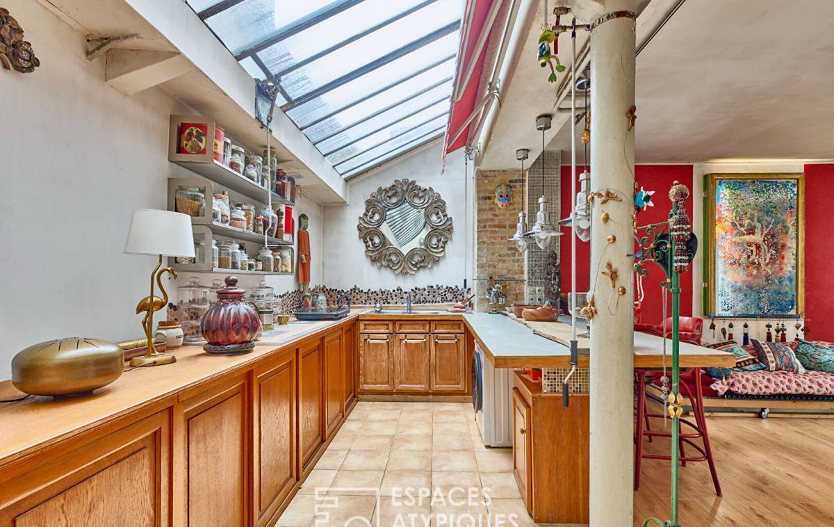 The entrance opens onto a large open space with an open kitchen under a glass roof totaling 73 m2.