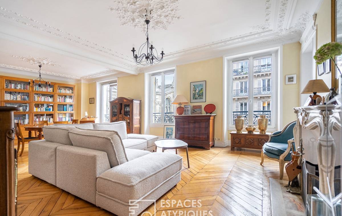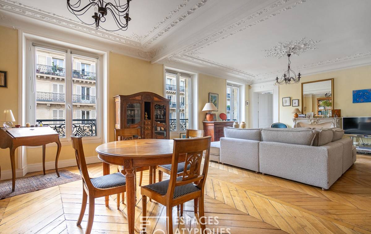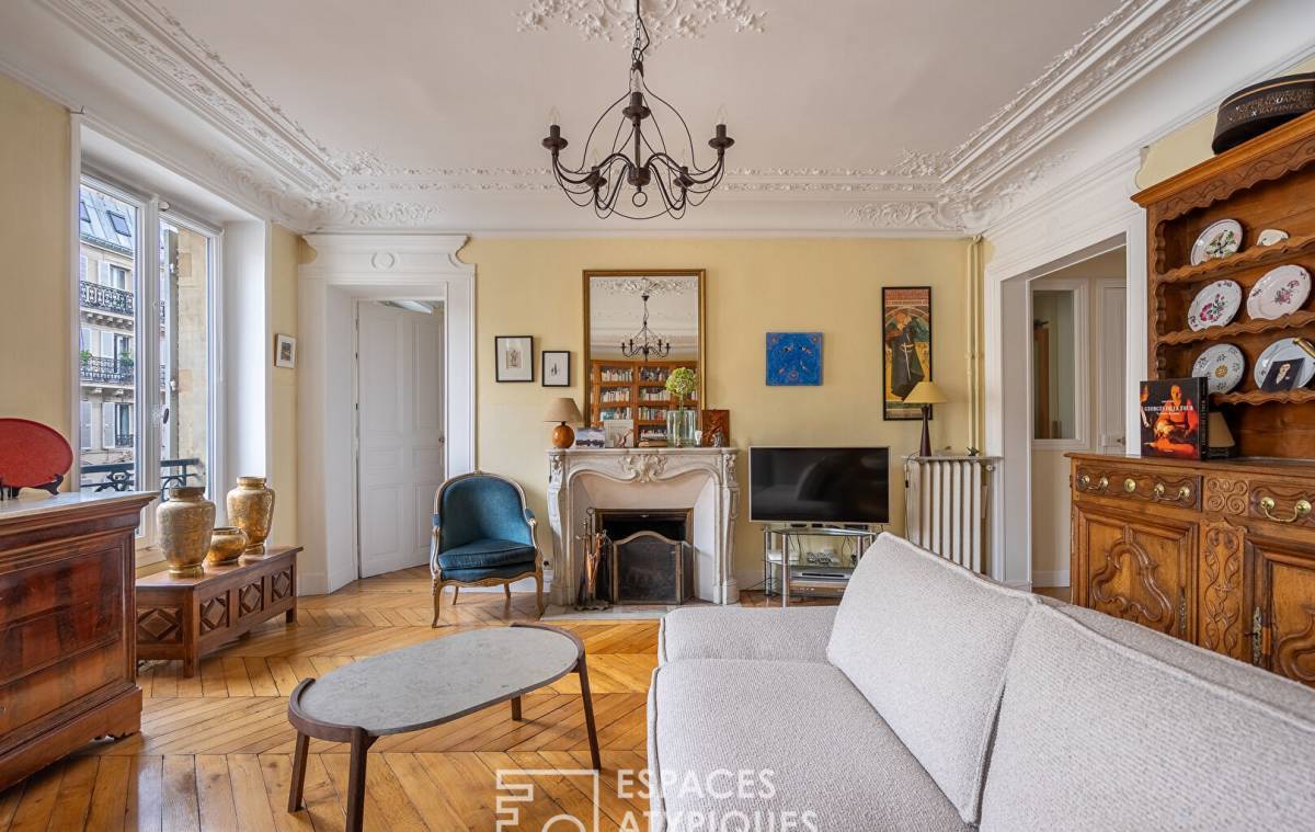 The dual-aspect apartment opens onto an entrance hall leading to a spacious 45 m² reception room bathed in light thanks to its four windows. Everything here contributes to the Haussmannian charm: herringbone parquet flooring, delicate moldings, a marble fireplace, and generous ceiling heights.