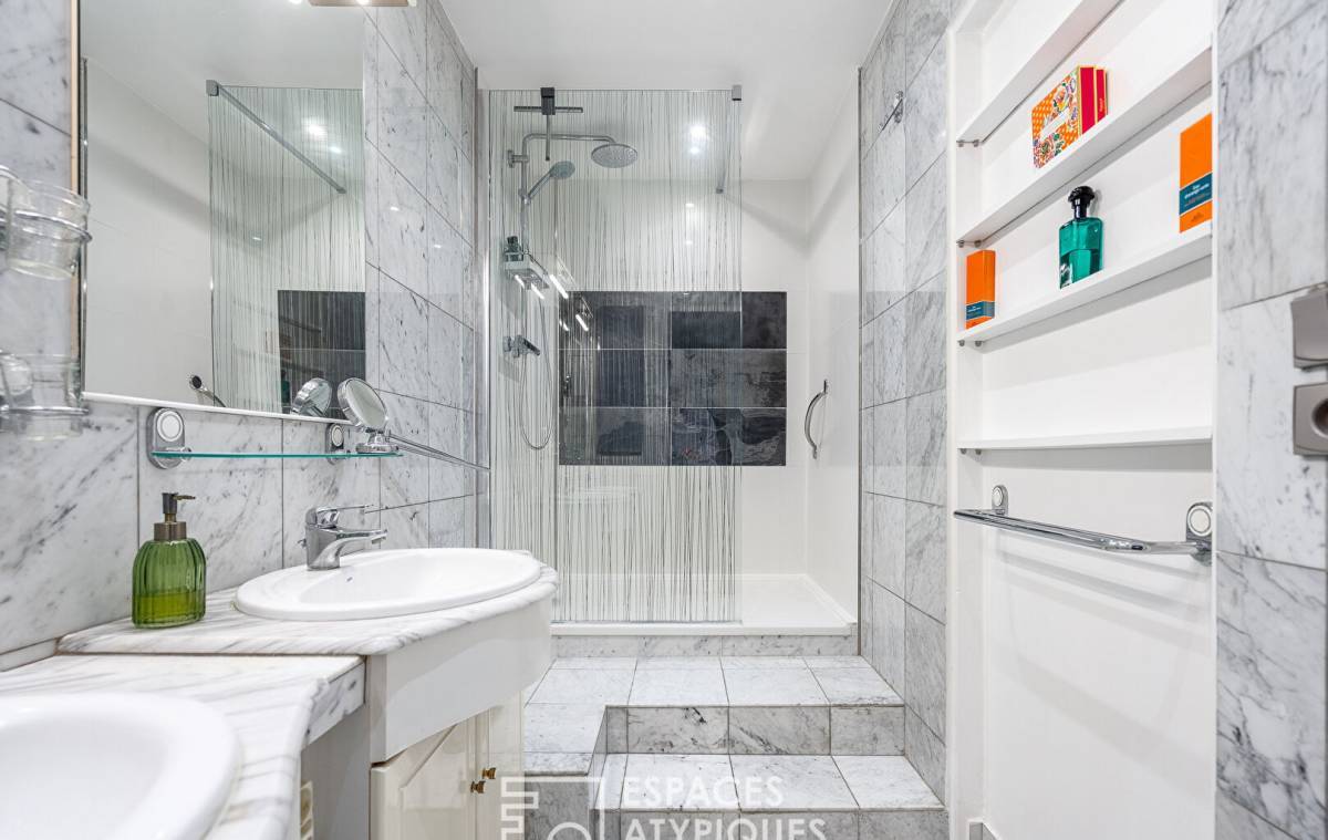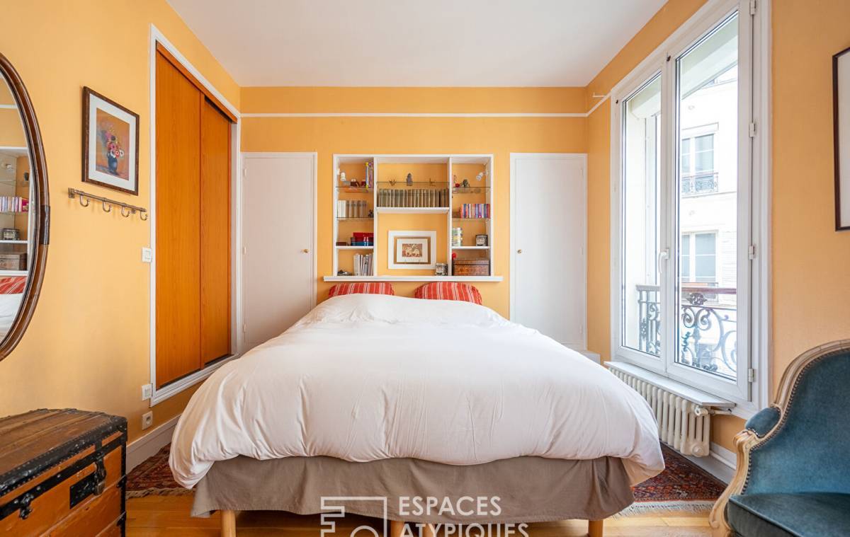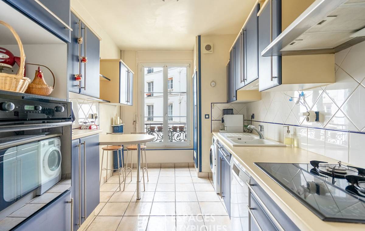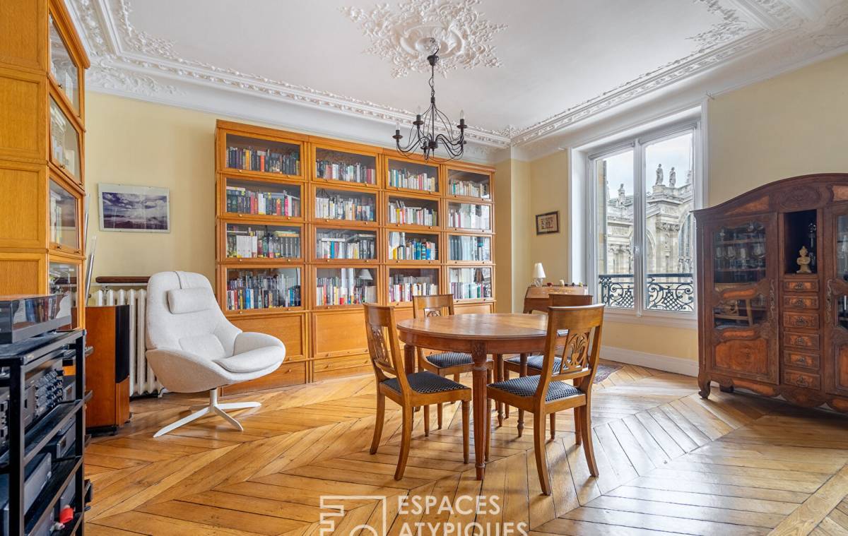 The dual-aspect apartment opens onto an entrance hall leading to a spacious 45 m² reception room bathed in light thanks to its four windows. Everything here contributes to the Haussmannian charm: herringbone parquet flooring, delicate moldings, a marble fireplace, and generous ceiling heights.