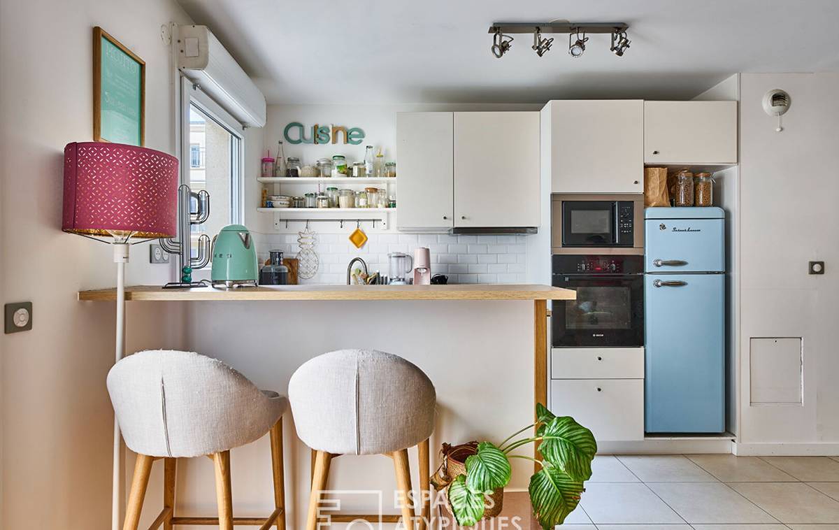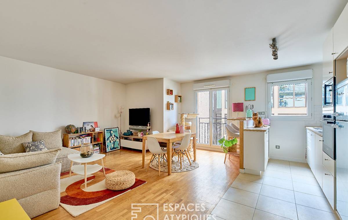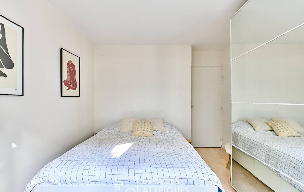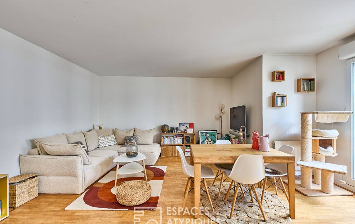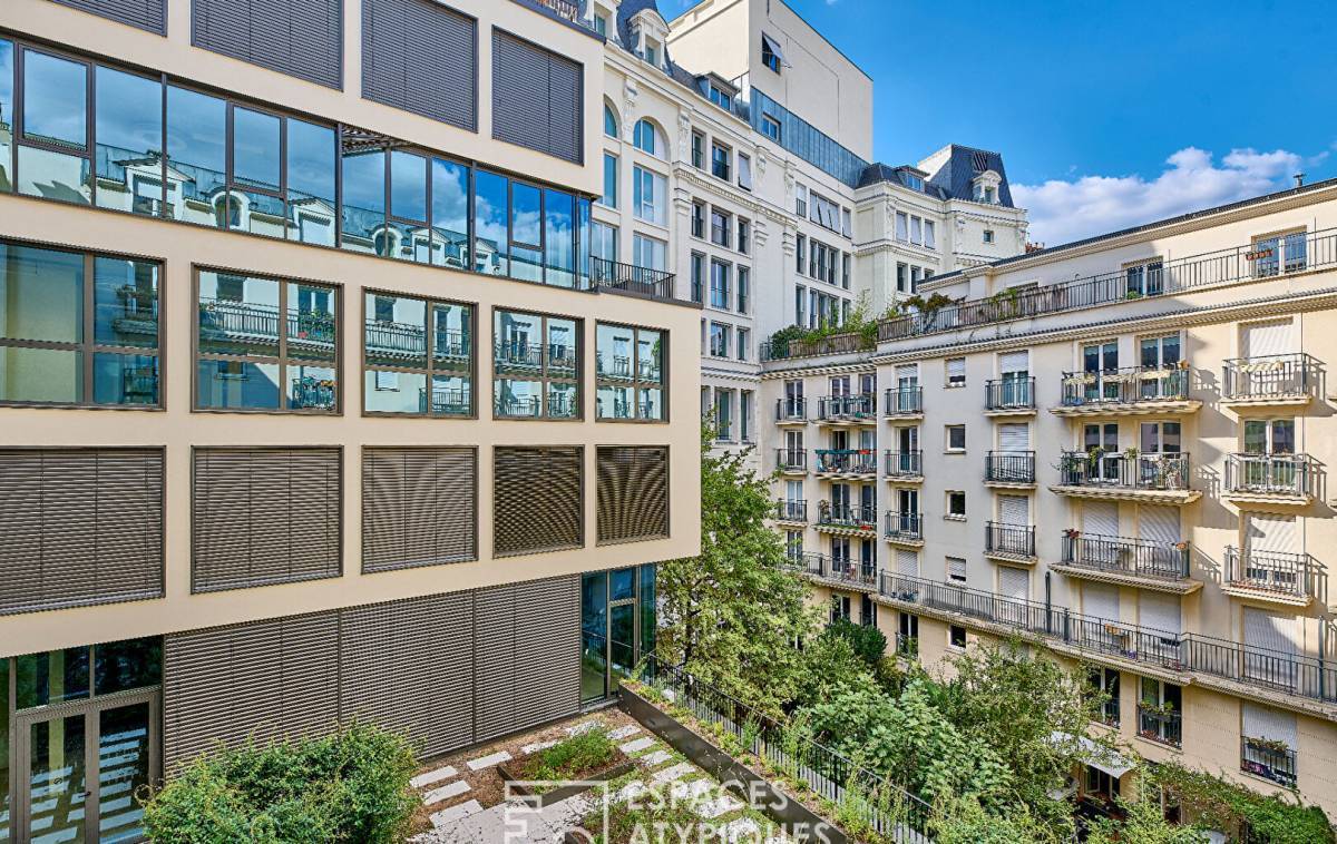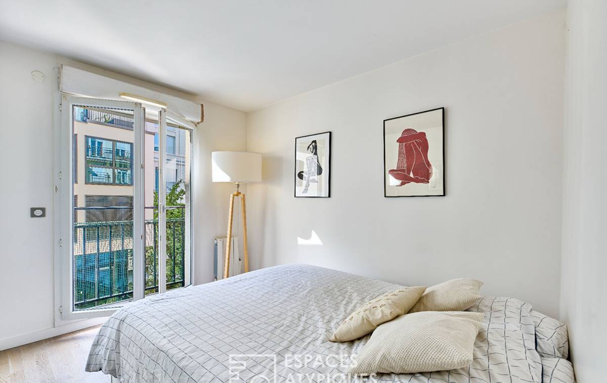 Within the grounds of the former Dufayel department stores, close to the new WOW coworking space, and nestled in the quiet, tree-lined courtyards of a recent residence dating from 2001, this 49.92 sqm Carrez apartment with two balconies is a true haven of peace.