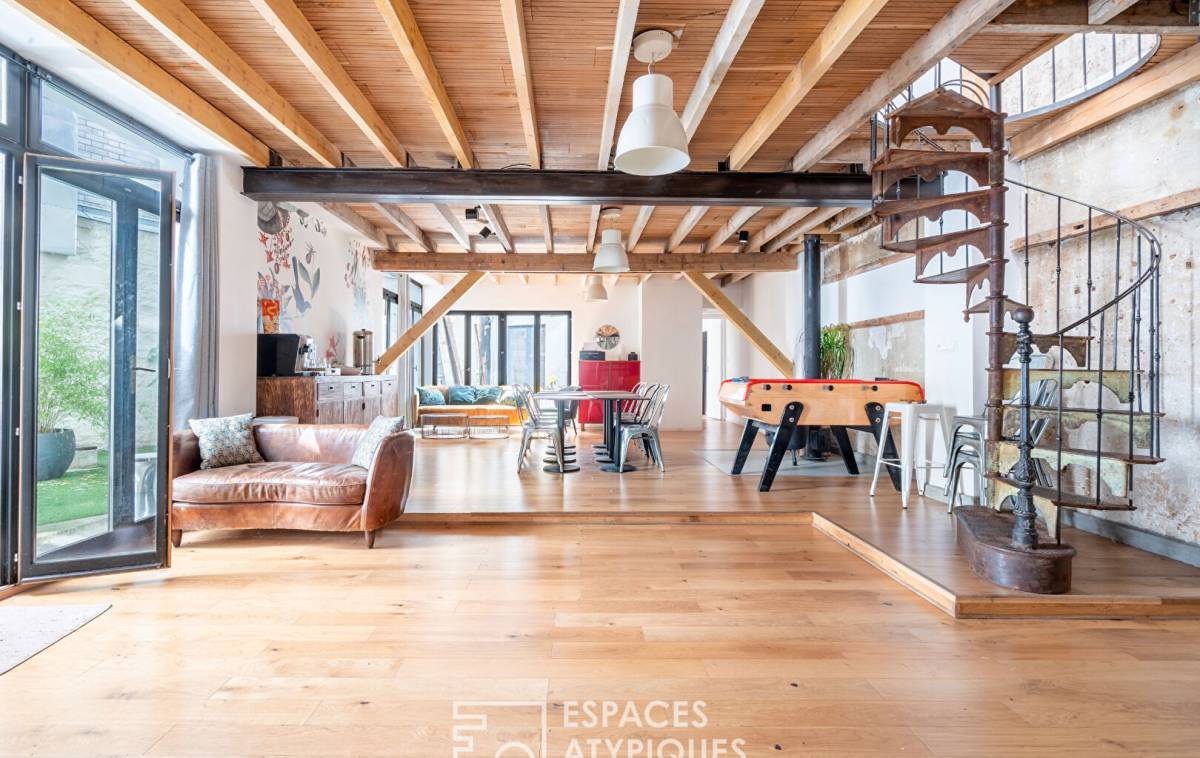 Located in the Saint-Blaise district, this unique 244 m² (224.37 m² Carrez law) space, created by the transformation of a former carpentry workshop into a photography studio, subtly blends industrial style with contemporary comfort. It benefits from a mixed residential and commercial use and is spread over two levels, each floor offering access to a 20 m² courtyard for exclusive use.
