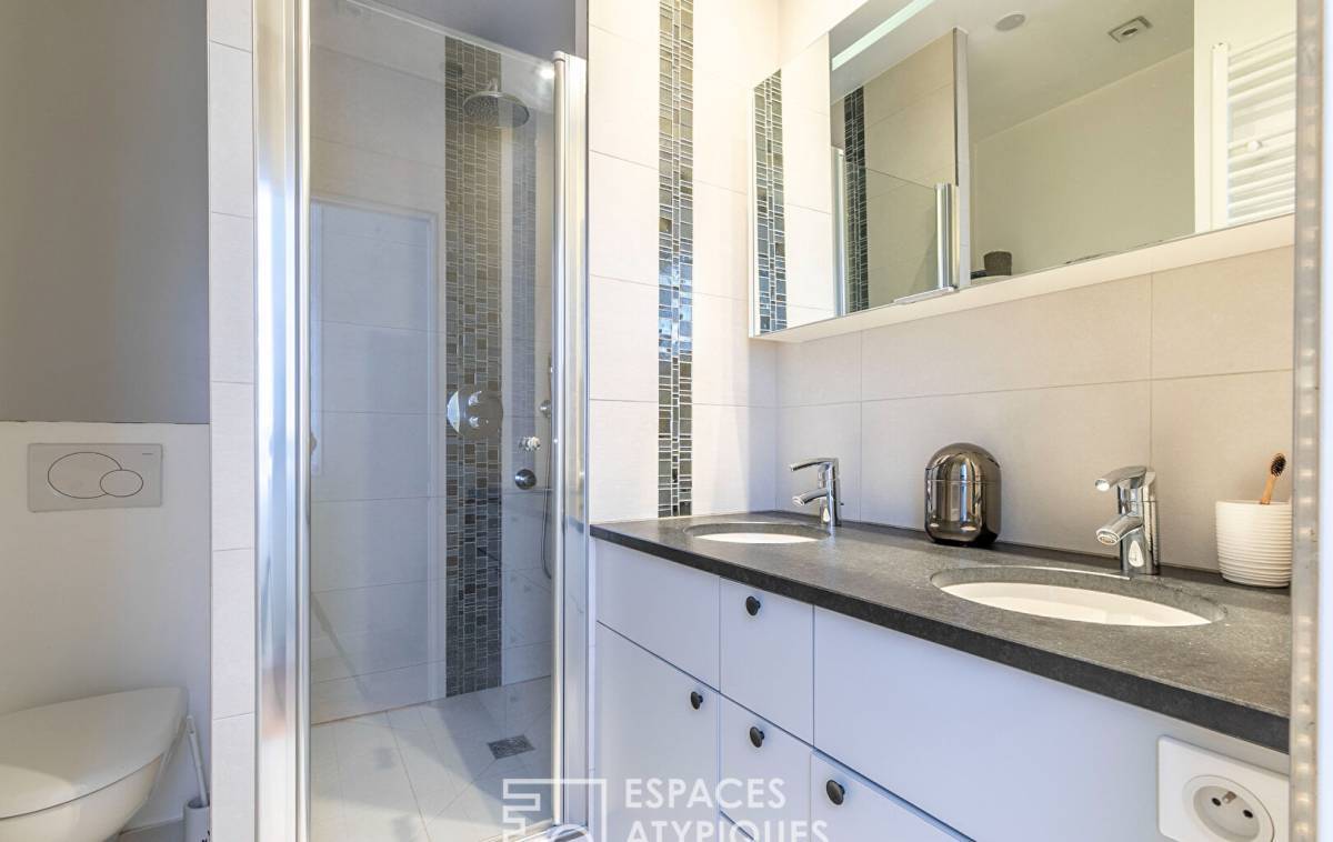 Inside, a large living room bathed in light highlights an open American kitchen and two mezzanines that create unique living spaces.