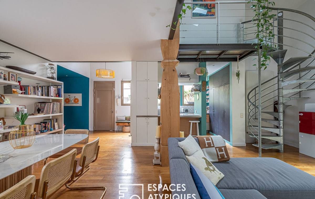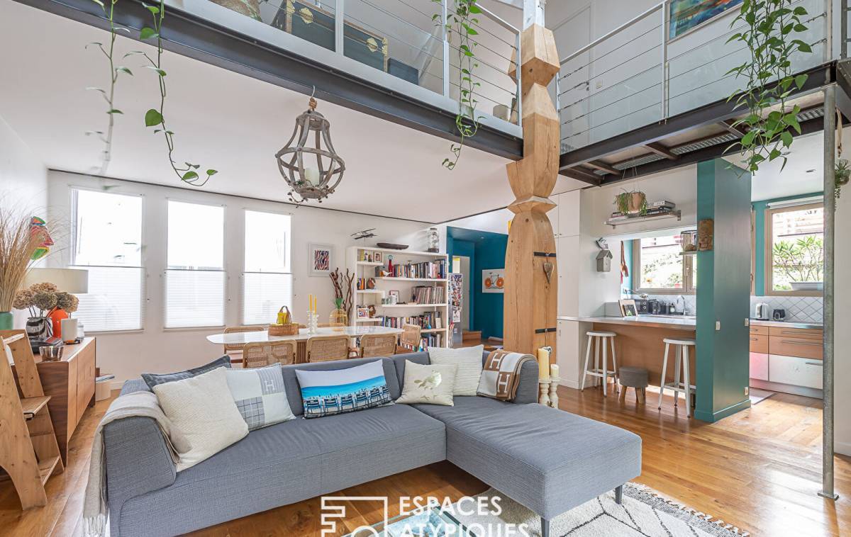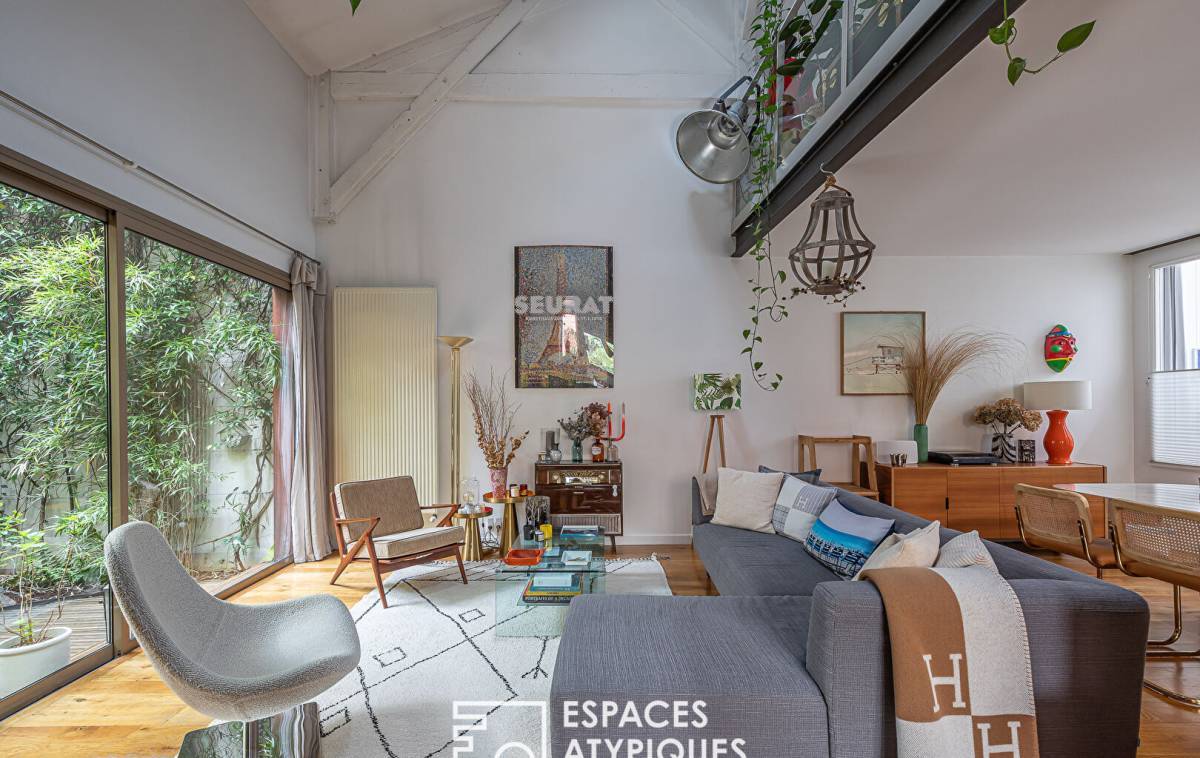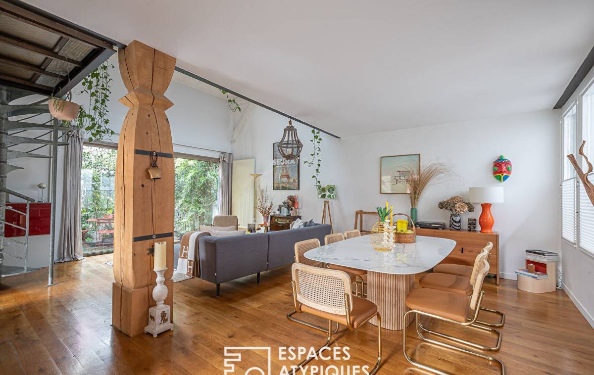 Located between the Belleville park and the Père-Lachaise cemetery, in a former biscuit factory, completely rehabilitated and divided into several lots, this house-style duplex of 185.05sqm Carrez benefits from a 22sqm terrace for exclusive use. The entrance to the ground floor opens onto a living room with semi-open kitchen totaling 57sqm under 5.70 meters in height, bordered by the terrace. A hallway leads to a master bedroom, a shower room with toilet and a laundry room. A second hallway with storage leads to a space dedicated to children, made up of two bedrooms sharing a bathroom and shower with toilet. From the living room, a metal helical staircase leads to a 30sqm mezzanine (23.14sqm Carrez) made up of an office and a relaxation area, all 2.75 meters high lit by roof windows. Convertible attics offer multiple development possibilities. Benefiting from absolute calm, this wooden-framed family living space has been redesigned in a resolutely contemporary style suitable for entertaining. A private bicycle/stroller room of almost 7sqm, as well as a car parking space in the basement in a nearby condominium complete this property. Subject to co-ownership status. Photos available on request Metros: Jourdain, Gambetta and Ménilmontant ENERGY CLASS: D / CLIMATE CLASS: D. Estimated average amount of annual energy expenditure for standard use, established based on energy prices for the year 2021: between EUR1,850 and EUR2,550 Information on the risks to which this property is exposed is available on the Géorisks website: RSAC: Paris