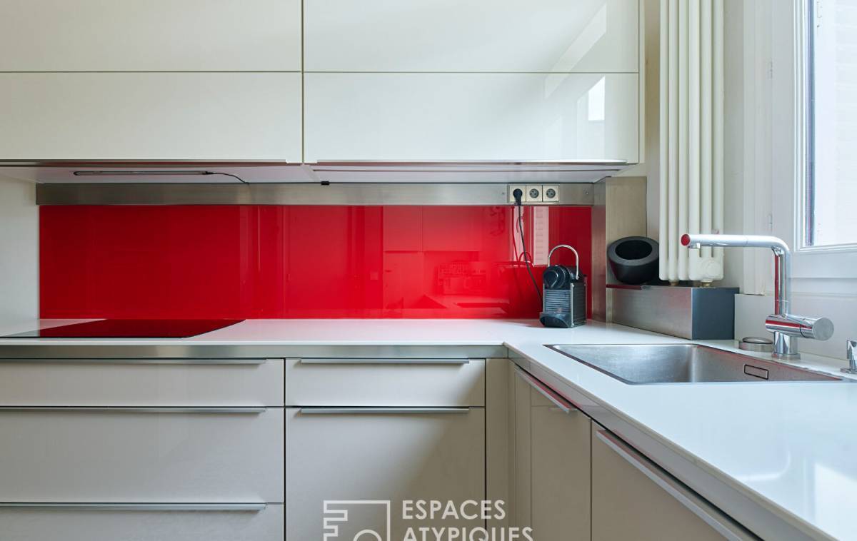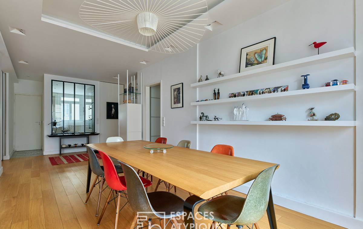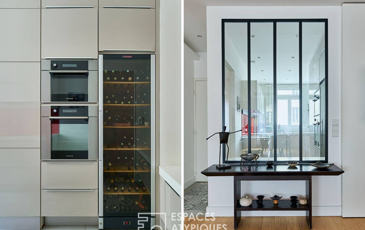 The separate, fitted and equipped kitchen subtly interacts with the living room thanks to a workshop glass roof, creating a fluid perspective while preserving the through character of the property.