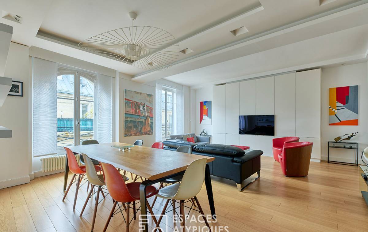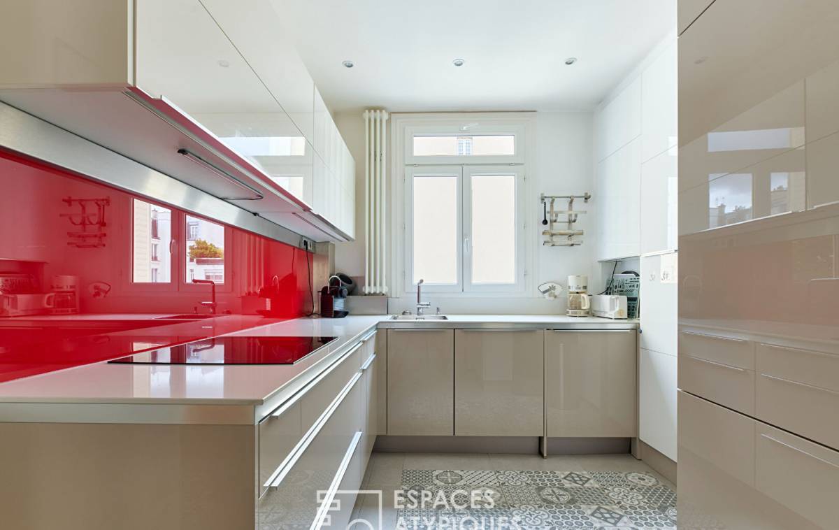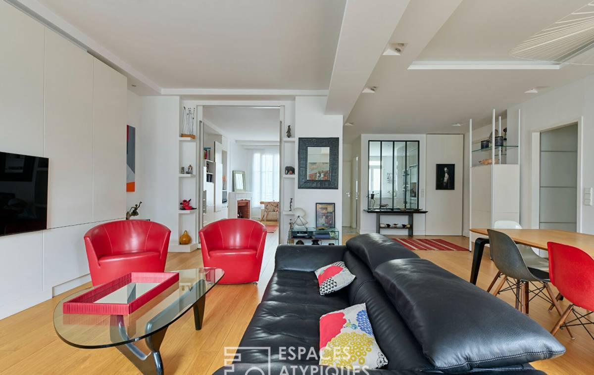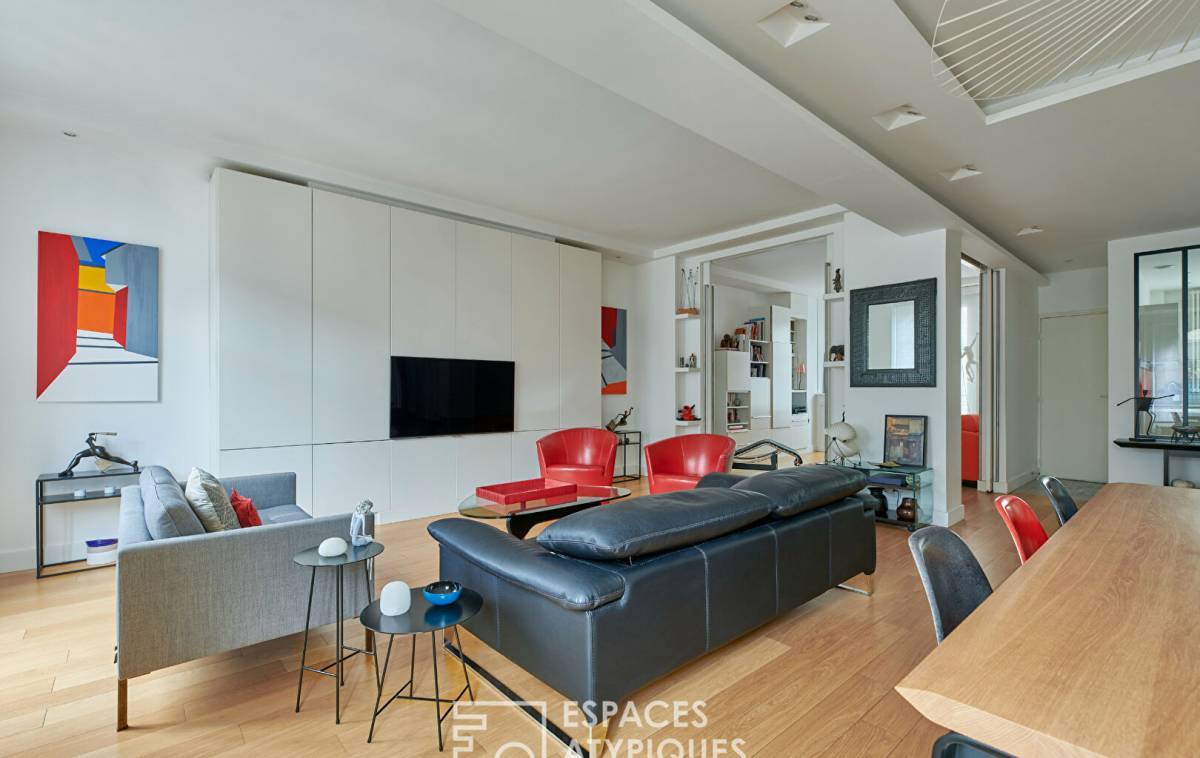The separate, fitted and equipped kitchen subtly interacts with the living room thanks to a workshop glass roof, creating a fluid perspective while preserving the through character of the property.